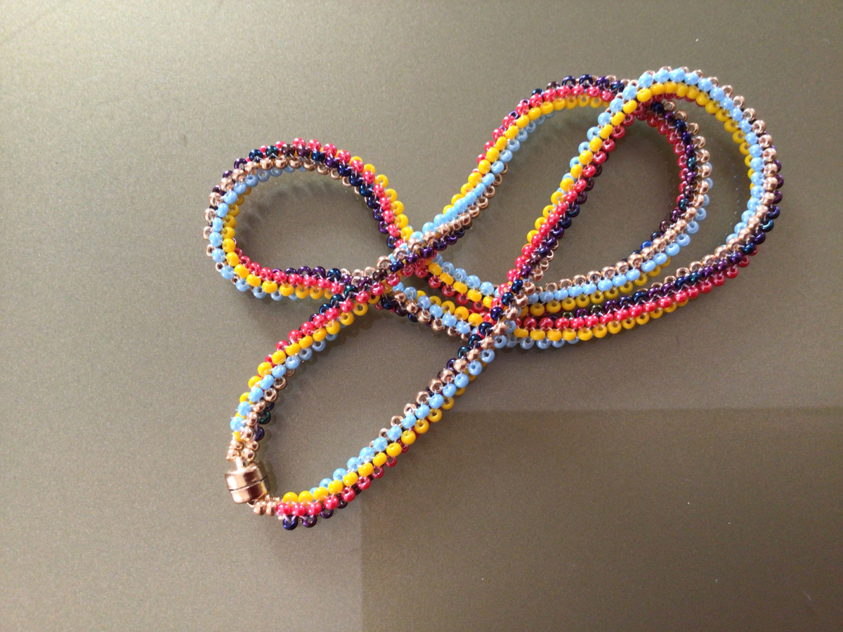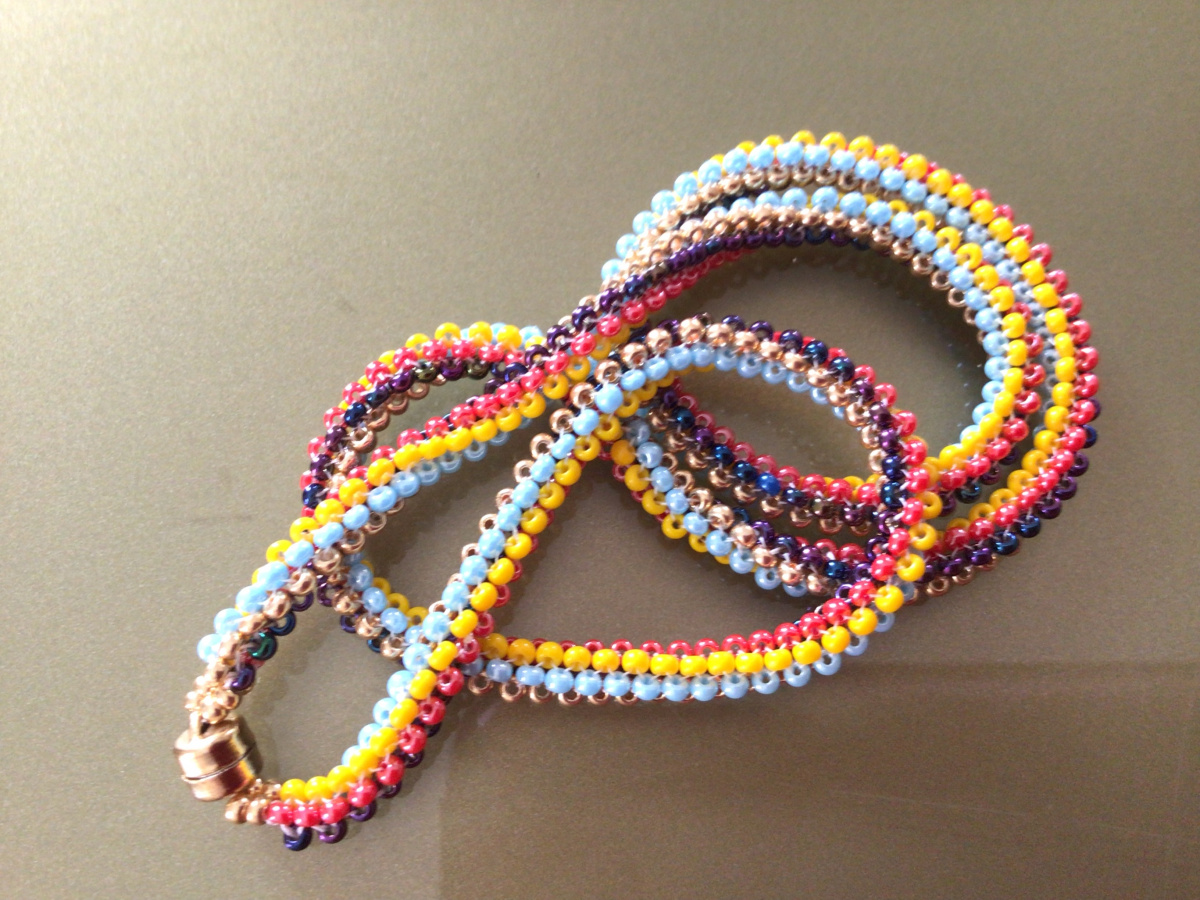 Там жгутик и всего-то на три бисерины, но так интересно смотрится. И золотой. Как раз то, что надо. К иностранным длительным вступлениям я почти всегда готова. А она говорит, говорит, говорит…. Понять бы что. Видимо она поняла рисунок своей работы. Сосчитала количество получившихся линий в своей работе в своём золотом жгутике и решила посмотреть как оно будет смотреться, если сохранить каждую линию своим цветом. А я то думаю…. Че это она? Жгутик одноцветный, а она выкладывает аж пять цветов! И это на три бисерины! А куда ещё два девать. Ну вобщем заинтриговала. Сижу наблюдаю, а она говорит, говорит, говорит. Говоруха, короче попалась. Ну и я попалась. Отодвинула на край бабкин жгутик, приготовила пять разноцветных кучек и пошлооооо. Сижу ржу, аки коньяка!!! Развела таки, волшебство в трёх соснах на пять цветов.