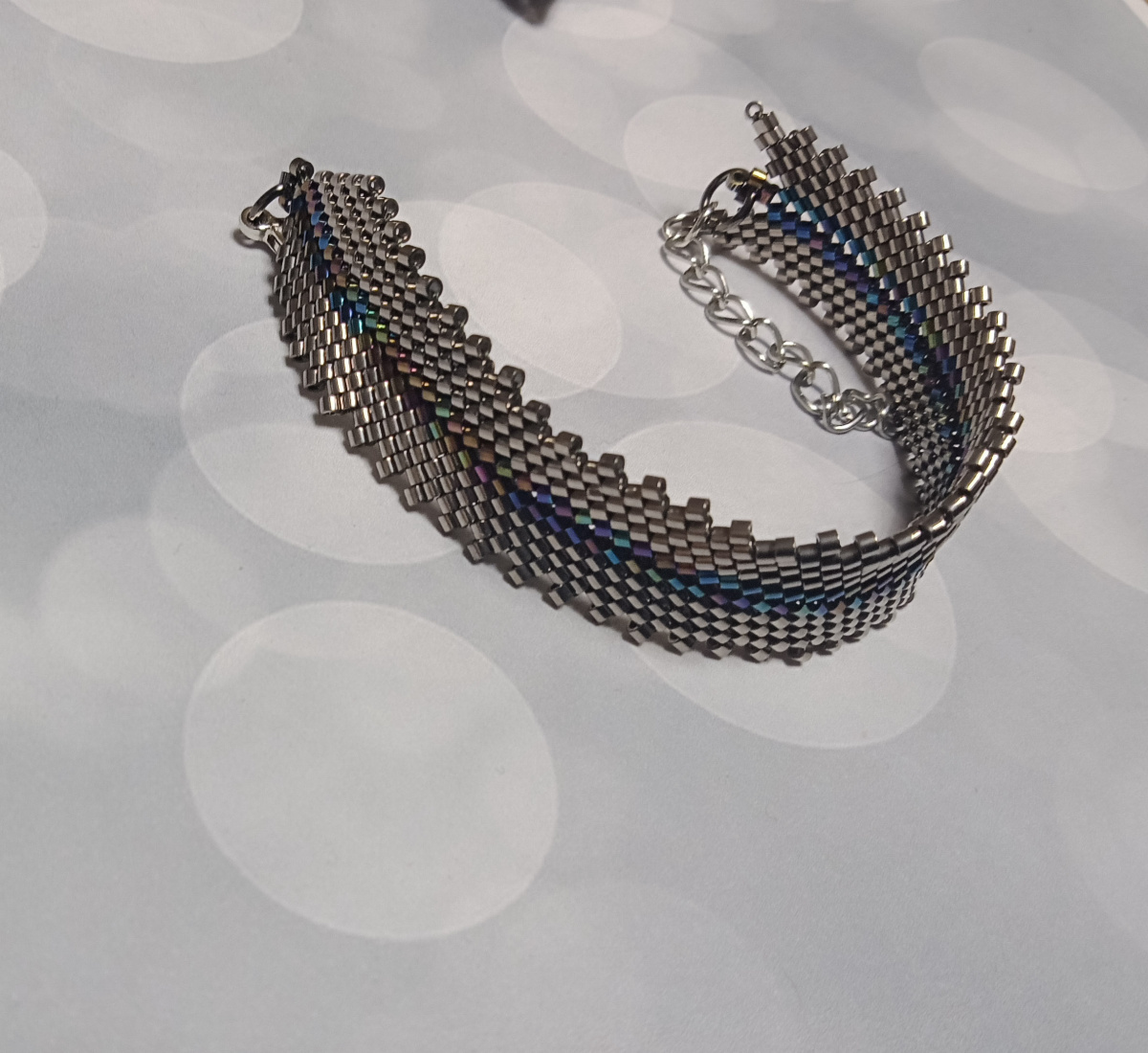 Иногда мне даже кажется, что сами по себе бисеринки прокрашены по-разному: какие-то более светлые, а какие-то более темные и что именно из-за смешивания нескольких оттенков серебра, получается такой эффект.