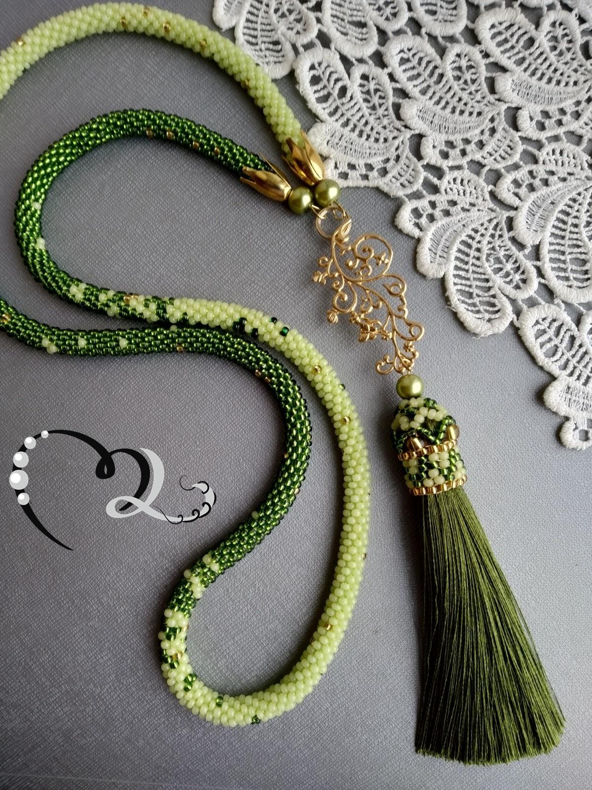 В предпоследнем — гениально подобраны материалы (в первом тоже, но именно здесь расхожая фраза о том, что все гениальное просто, обретает глубину). Два оттенка зеленого, кажется, даже чешского бисера, крошечный золотистый акцент, перекликающийся с того же оттенка фурнитурой, изящная металлическая филигрань, текучая кисточка… И настоящий шедевр в итоге.