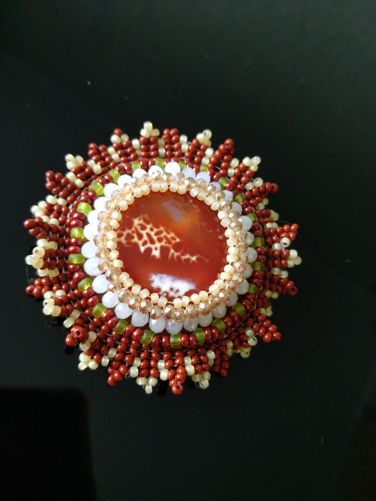 Вот надо выставлять такое, надо. И мне говорили, что надо, чтобы понимать что с новичками делать, да всё ж не собраться) Сейчас на вашу брошку с агатиком смотрю, и думаю в таком стиле предложу ученице «орден» делать, а то у меня свежая головная боль: дама хочет орден шить, но за вышивку ещё даже не брались, а позанимавшись с ней плетением понимаю, что хотелки, которые она мне показывает, хорошо если через полгода ею могут быть освоены. Ох… А вот кабошончик с лучиками — может быть вариант. И симпатичный, и без уймы техник, почти базовый вариант.