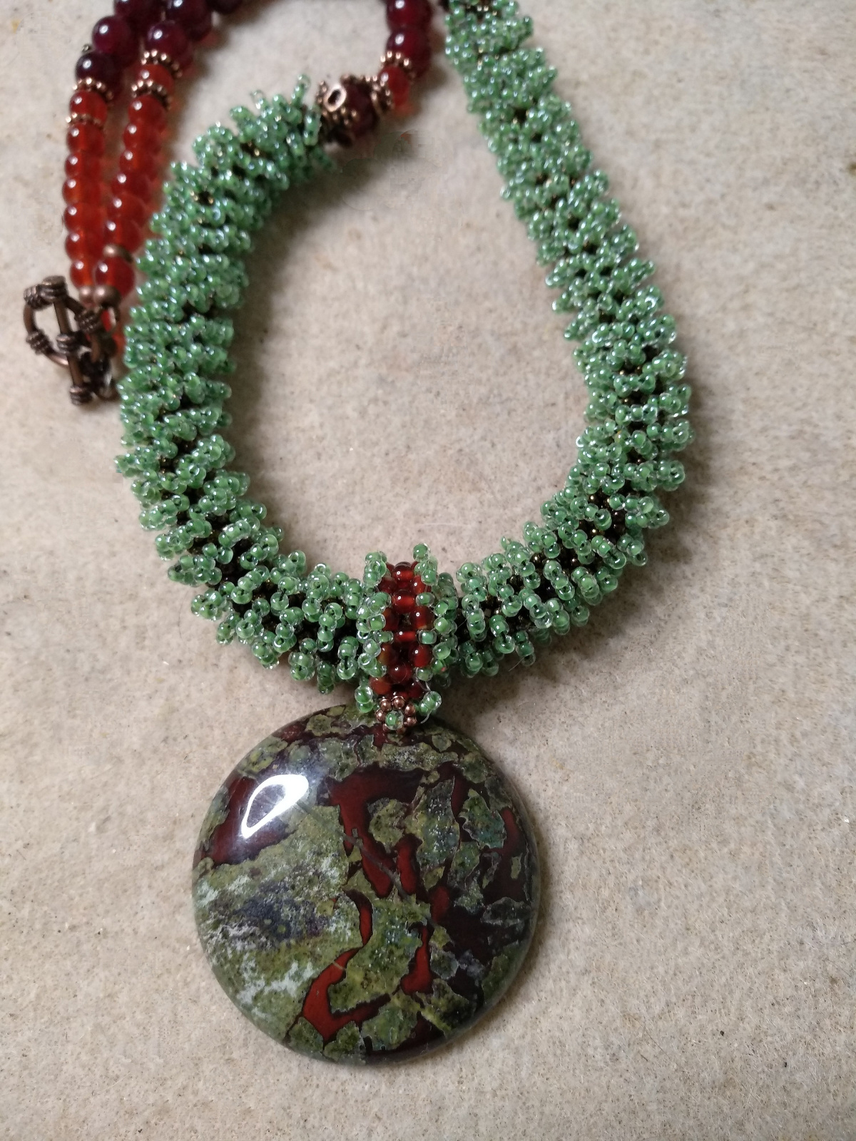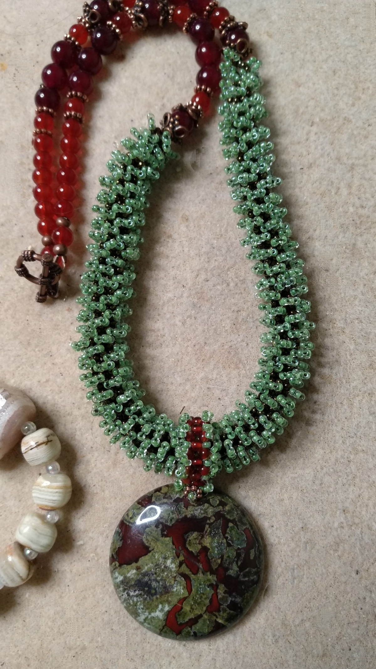 Вот такой пушистый жгут с кулоном гелиотропа, который называют также кровь дракона. Красивый камень со всех сторон, поэтому не стала ни оплетать, ни вышивать, оставила в первозданной красоте