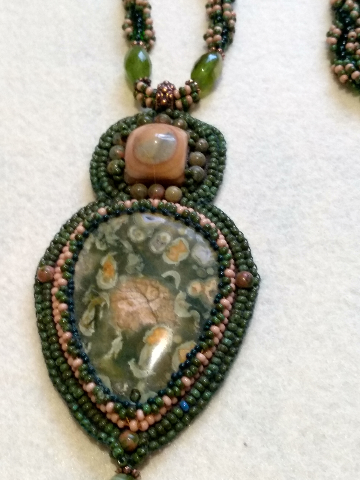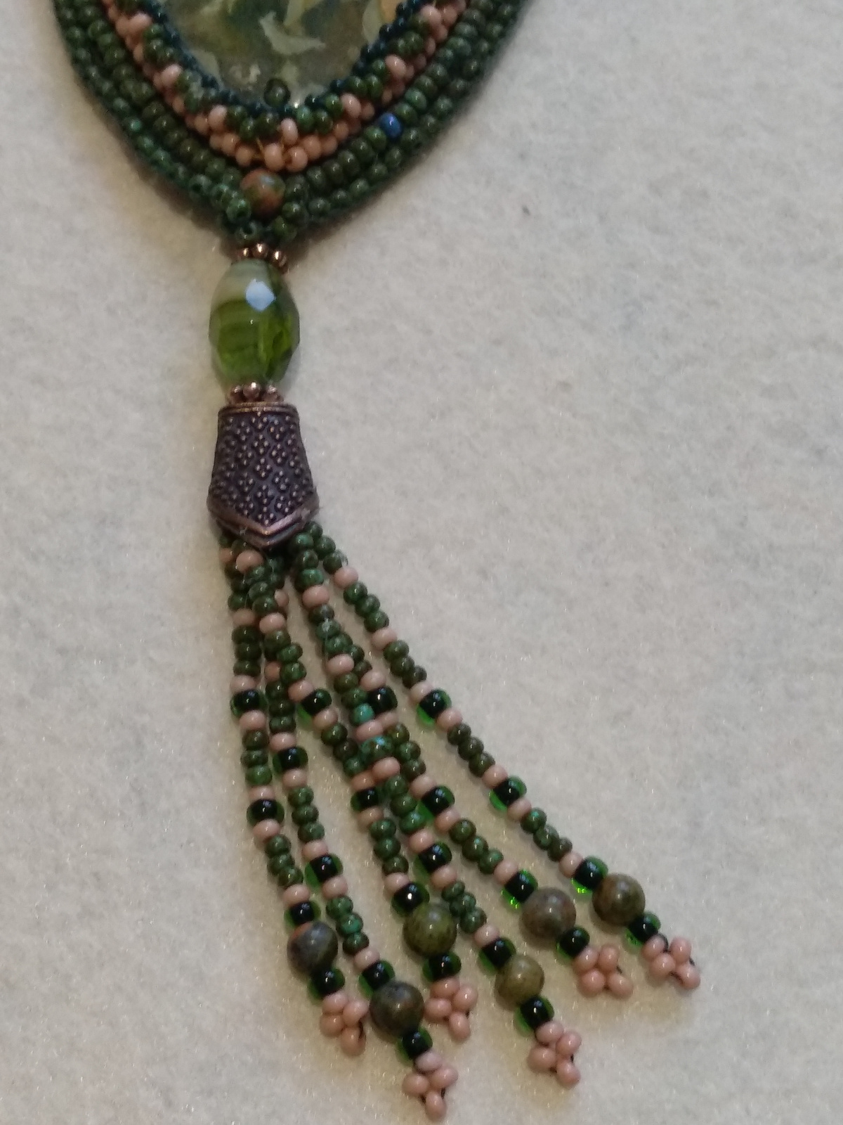 Ниночка, спасибо, как же я рада Вам. Да, подбирала тщательно, чтобы камень был главным, ничто его не портило, а подчеркивало. Вот просто без глазкого агата сверху кабошон не смотрелся, был погасшим что ли. Перерыла все коробки с камушками и бусинами. Ничего!!! Потом взгляд упал на браслет с бусинами глазкого агата, только одна бусина из браслета идеально подошла по цвету- там даже зелёного было немного. Порезала браслет!!! В общем кабошон доволен, я тоже. Если бы фоткать ещё умела хорошо, эх…