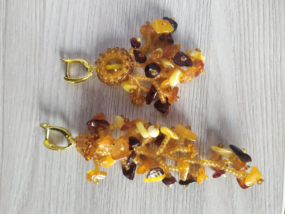 Тот самый янтарь из Калининграда потихоньку уходит в дело. Оказалось что очень люблю работать с янтарем и перламутром) Ну и пара сережек для комплекта.