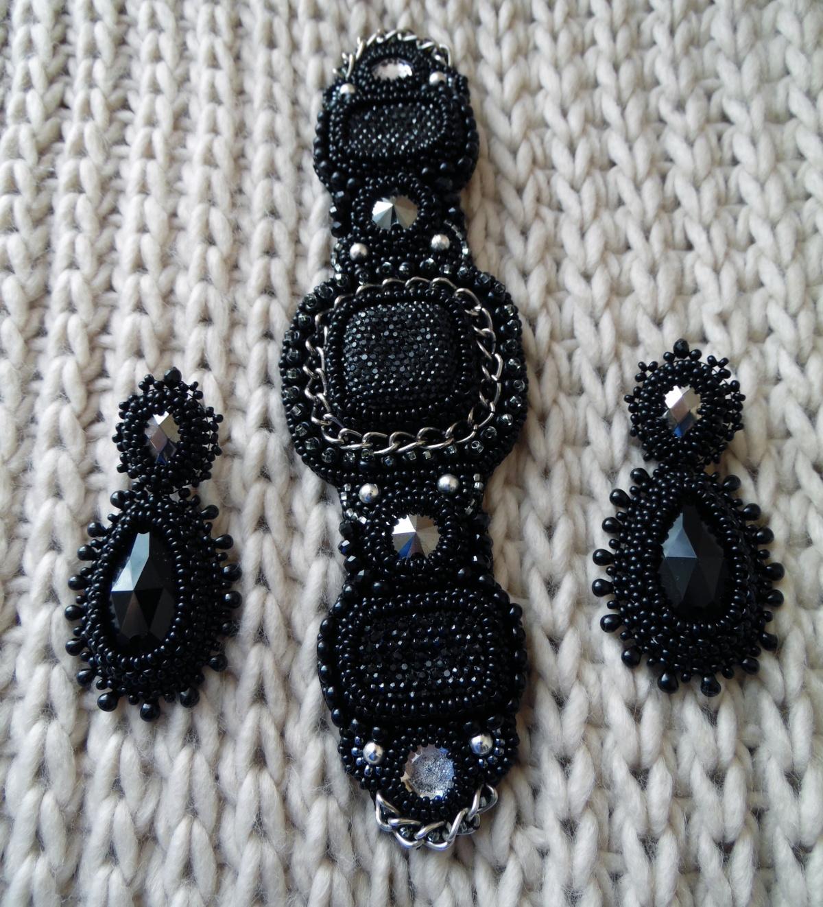 начала данную черноту я в роддоме)))после недели простого пролеживания, сказала соседке:«сегодня доделаю вышивку и завтра пойду рожать!!!» Не поверите, вышивка была сделана в 23-45. А в 8 утра отошли воды)))ну значит родила и… готовая вышивка убралась в шкаф на месяц, пока я привыкала к новому образу жизни, так сказать)кольешка обзавелась изнанкой именно после объявления флешмоба, а там уже и браслет как то быстро нарисовался и серьги… аж 2 пары… никому данную черноту не отдам, ибо она моя 100%-я) спасибо за внимание)