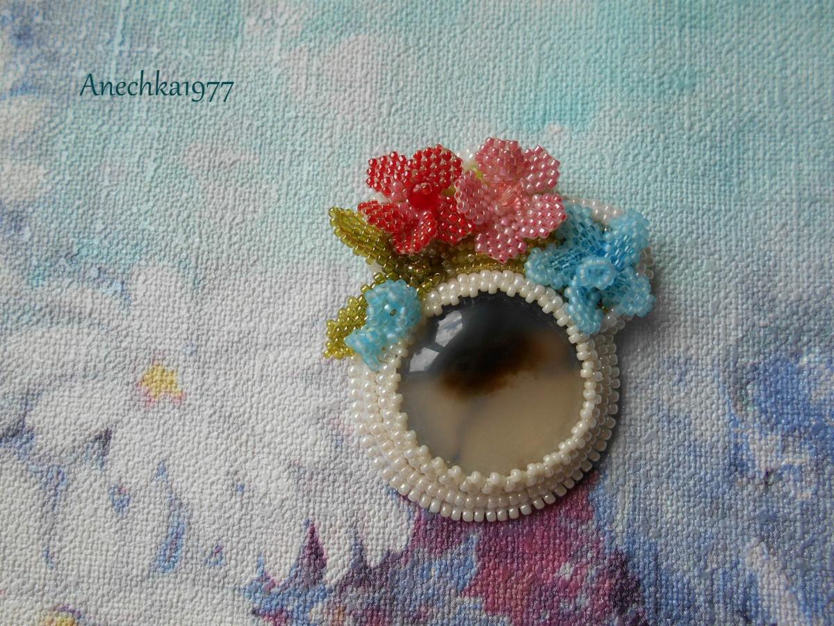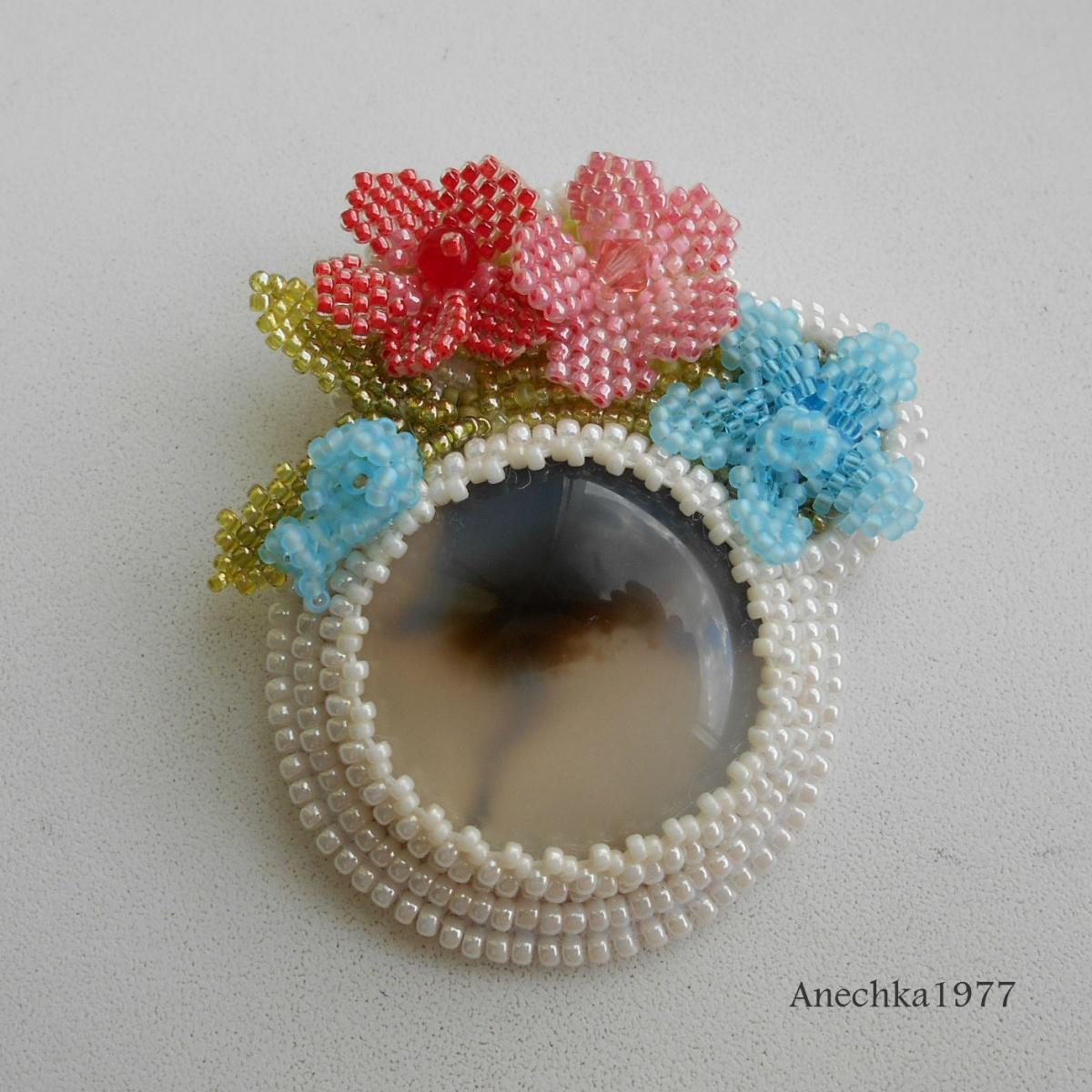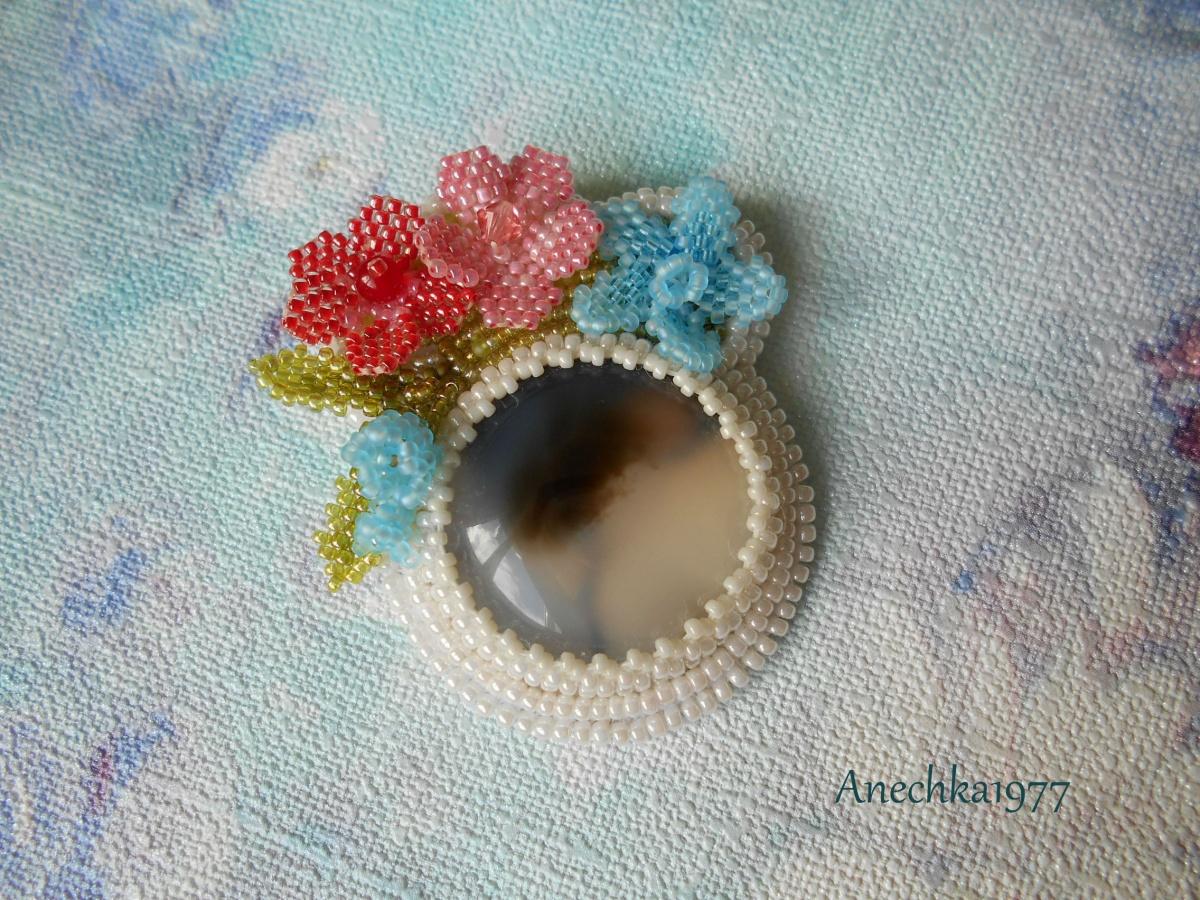 Брошь в подарок подруге, она же мне этот камень и подарила. Причём она видела в нём убегающего зверя. Я тоже, когда взяла камень в руки впервые, увидела, что он контрастный, драматичный. А когда задумала вышивать букет цветов в корзинке, решила, что сойдёт за вазу. Ну там вроде полосочка, как стебелёк, просвечивающий под водой.