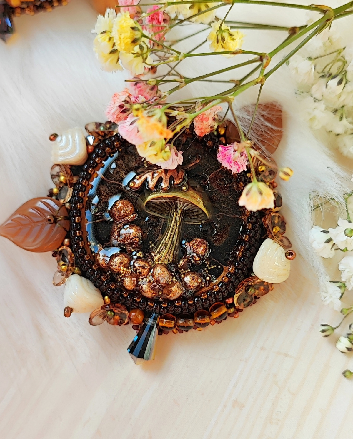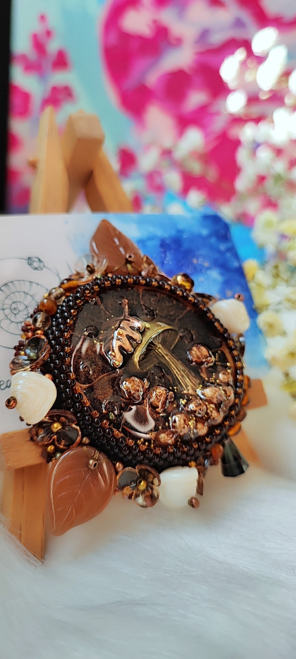 Материалы: кабошон из эпоксидной смолы ручной работы Кати Костиной, японский бисер, чешские стеклянные бусины, акриловые бусины, фурнитура, нить. Изнанка натуральная кожа.