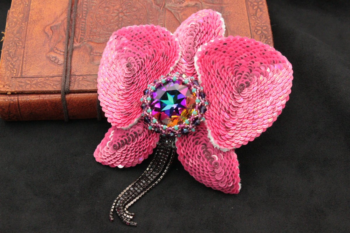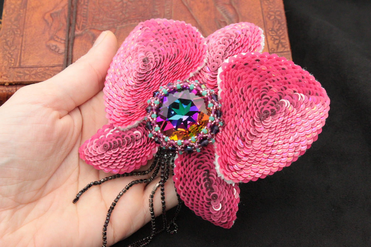 Продолжаю коллекцию тропических брошей. Орхидея — мой первый опыт вышивки пайетками в качестве основного материала. Так как раньше я никогда не заполняла пайетками большие площади, то намучилась с ними знатно — раза три приходилось распарывать уже отшитые лепестки и начинать заново)) А учитывая масштаб работы, бросить эту затею мне хотелось раз 100!