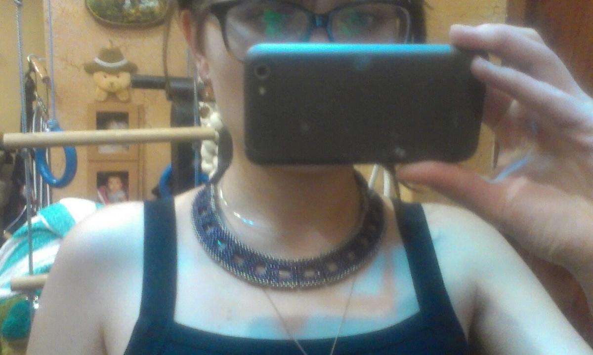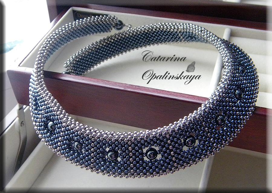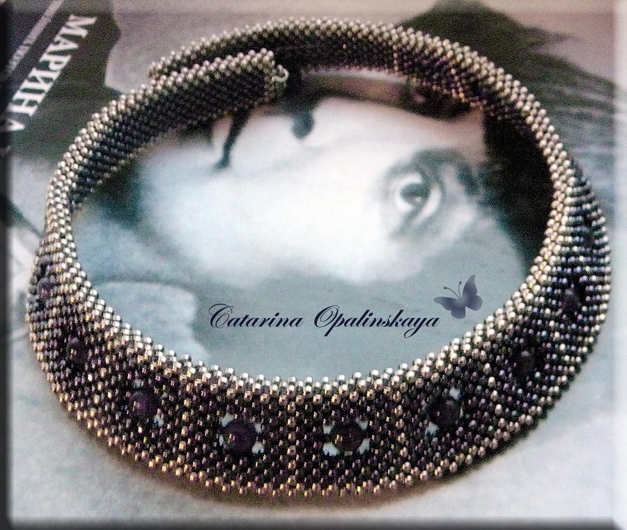 Потом последовал заказ, хотели цвет в цвет, но я уговорила заказчицу, что у знакомых не должно быть одинаковых украшений (я его вообще повторять не хотела, но кума уговорила) и стойку сделала не гематитового, а аметистового цвета, цвет получился более благородным (может потому что я больше люблю оттенки фиолетового) фото вечернее, цвета не видно, и различия наверное особого тоже, но я ж его плела? Вот и добавлю в альбом))