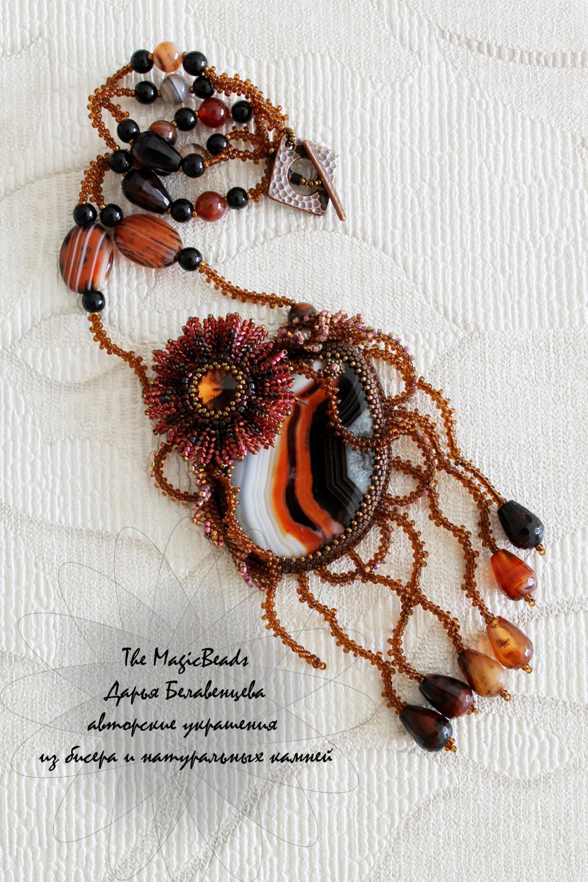 Материалы: кабошон сардоникса, кристалл Сваровски, капли сардоникса, японский и чешский бисер, бусины сердолика и агата.