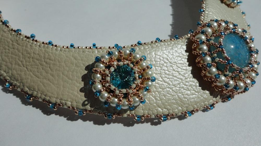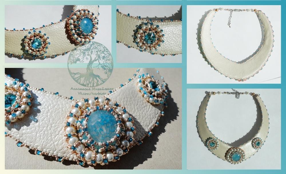 Это мое первое вышитое колье!!! Ну как вышитое… частично вышитое)) Полностью бисерное так и не получилось, хотя старалась, поэтому решила сделать такую частичную бисерную часть, тем более кожа красивенная в магазине попалась!