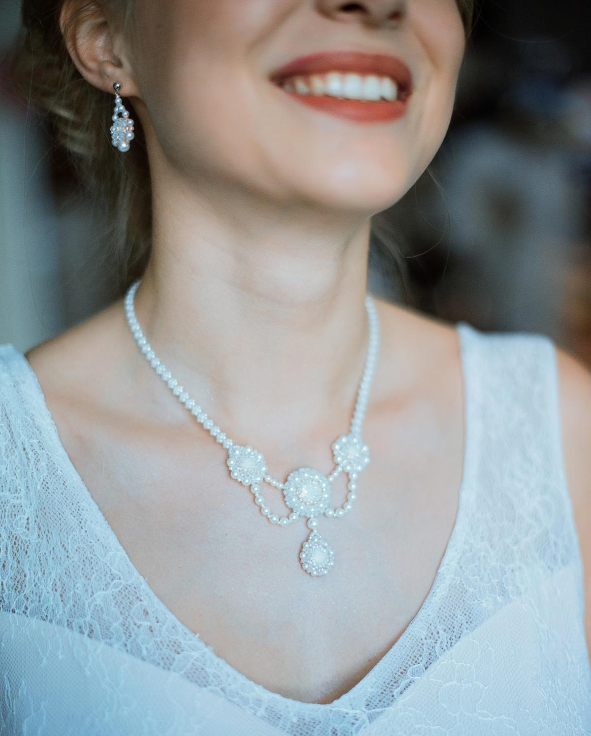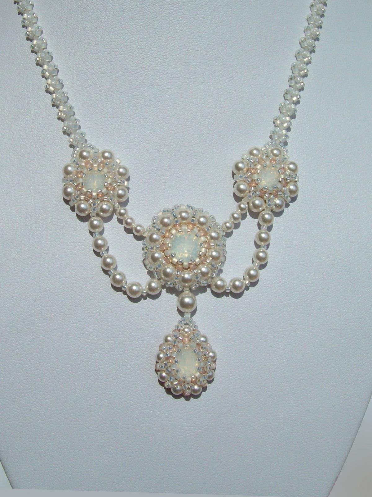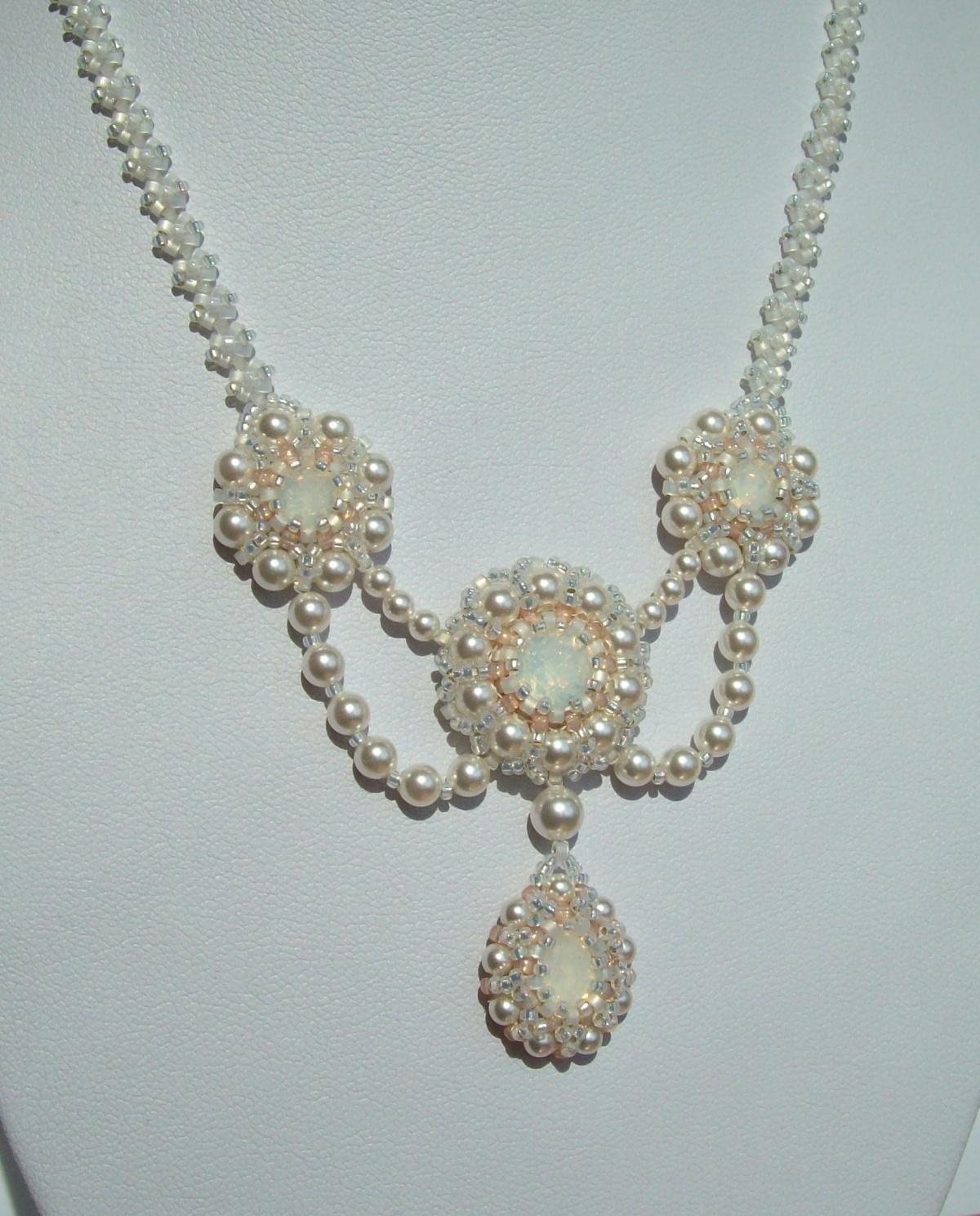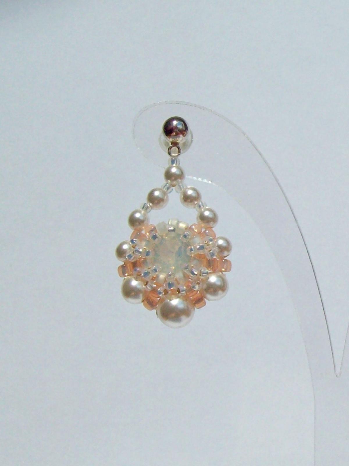 Теперь я могу представить вам небольшой комплект украшений для снохи дочери. Опаловые шатоны сваровски 6 и 8 мм, жемчужинки тоже австрийские. Оплетала деликой и тохо. Ничего экстраординарного; основные сложности были в предельном минимализме и подборе оттенков материалов. Прошу любить, жаловать и критиковать (при желании