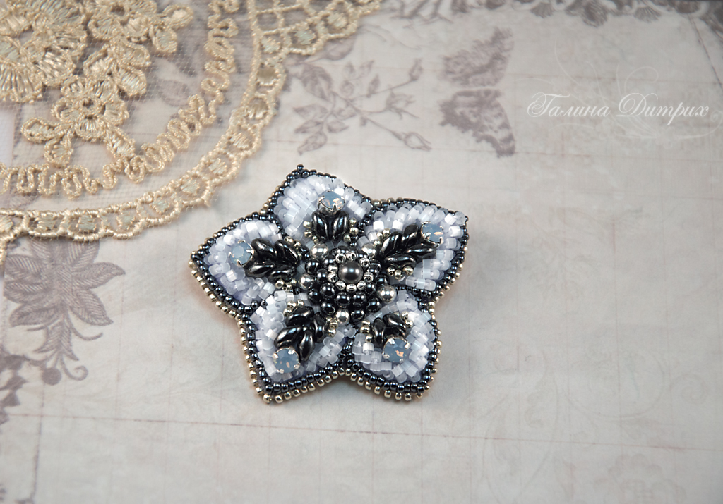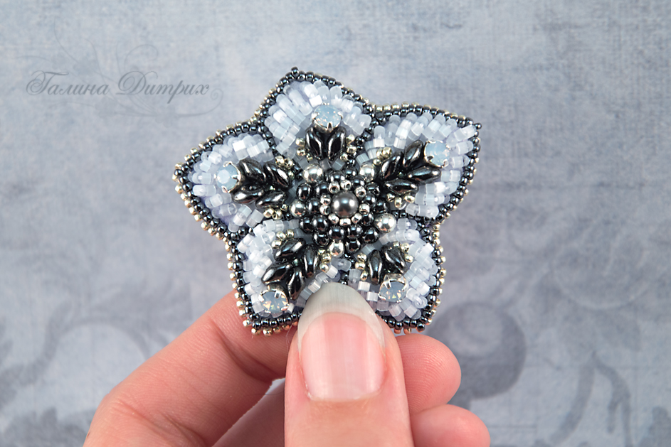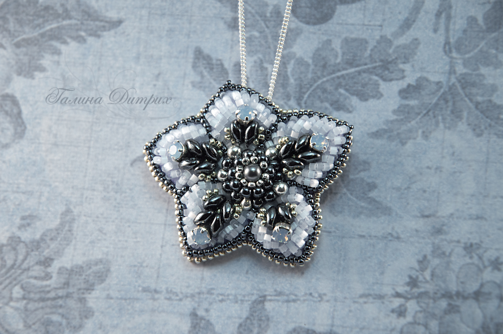 Очень нежная голубая брошь-кулон в виде цветка с гематитовым рисунком: объемная вышивка сатиновой Деликой, дропсами, чешскими бусинами Супердуо и опаловыми шатонами Сваровски в серебряной оправе. Эта шелковая делика просто сводит меня с ума, играет гранями как кусочки сахара на солнце...