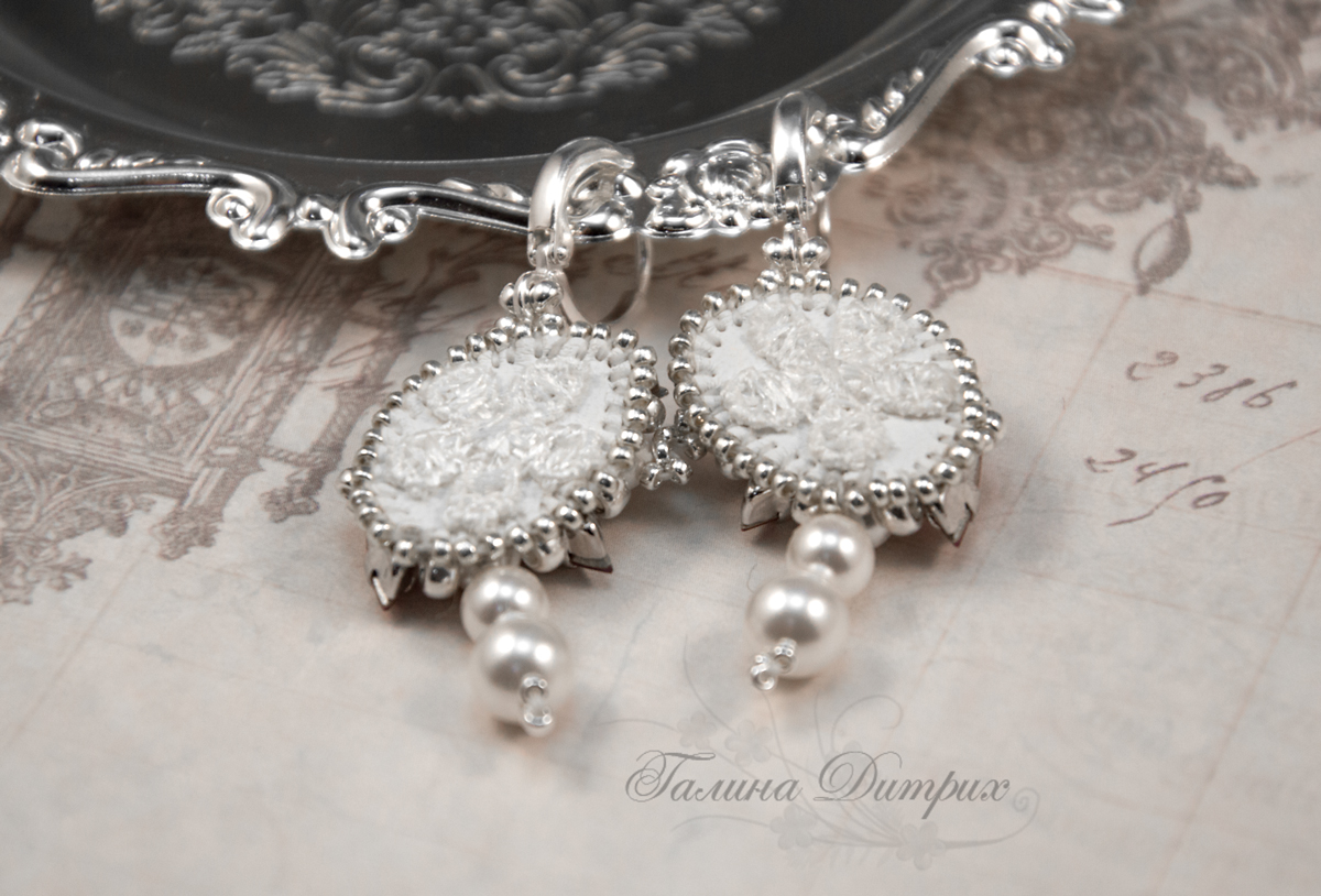 Швензы — посеребренная латунь. На изнанке белая эко-кожа и кружевные цветочки.