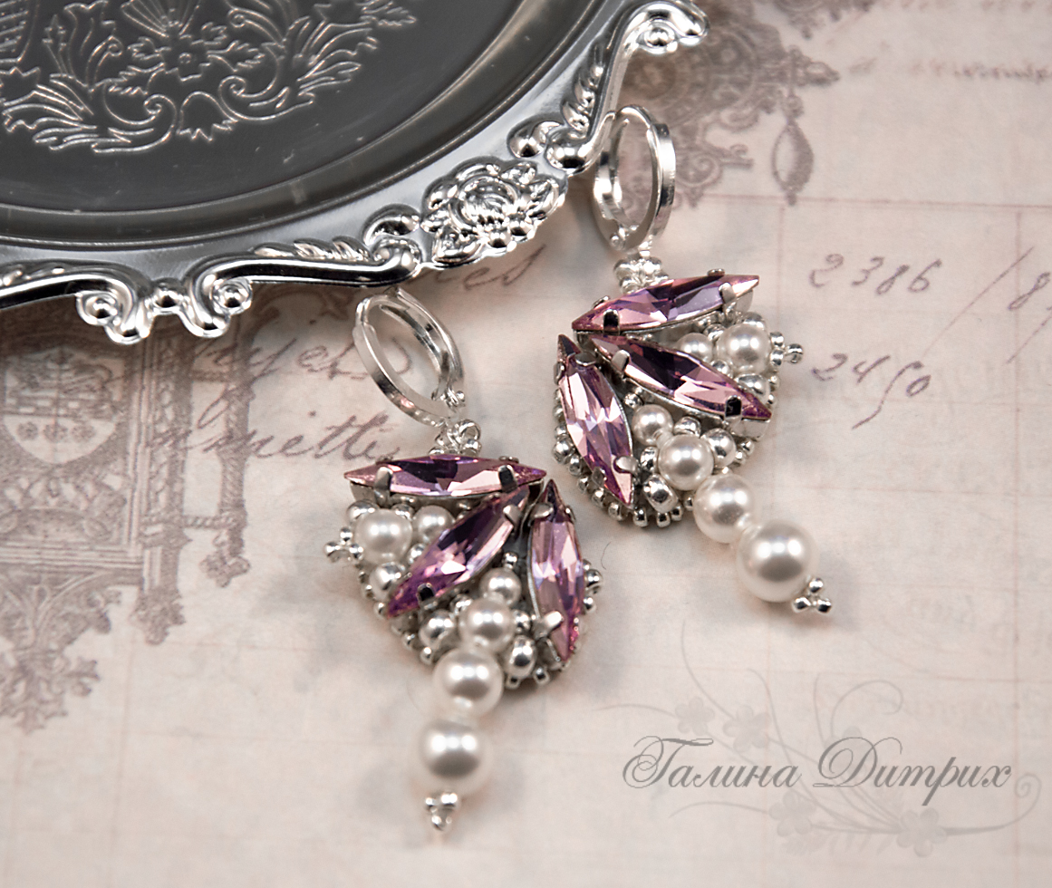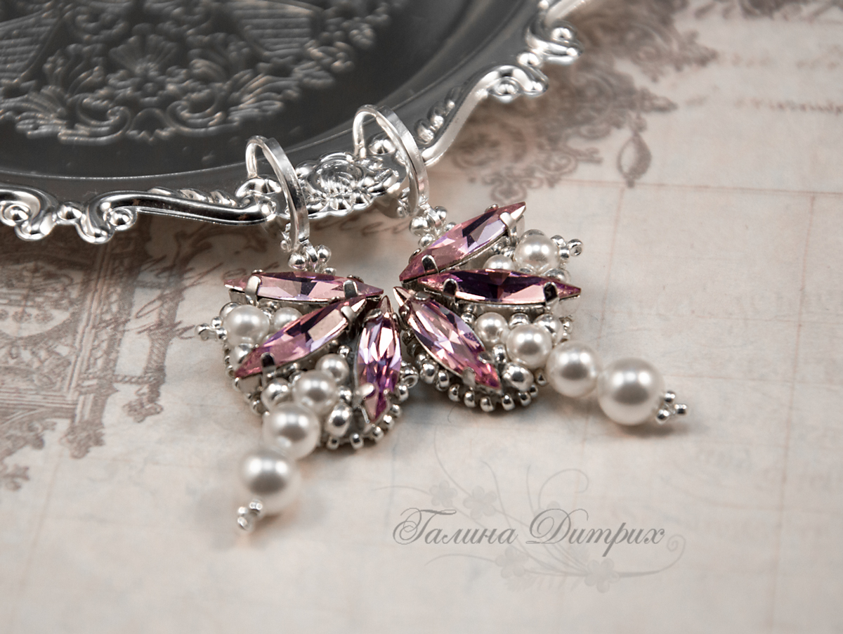Серьги с жемчугом и кристаллами Сваровски в абстрактной форме, напоминающей бабочку. В крылышках австрийский хрусталь ювелирной огранки формы «глазки Сфинкса» редкого цвета светлого аметиста. Кристаллы закреплены в родиевой оправе, в крылышках четыре размера жемчуга Сваровски и три размера японского бисера с драгоценным серебряным покрытием (и все это для таких элегантных малявочек! прямо мечта любой женщины — кушают и не толстеют