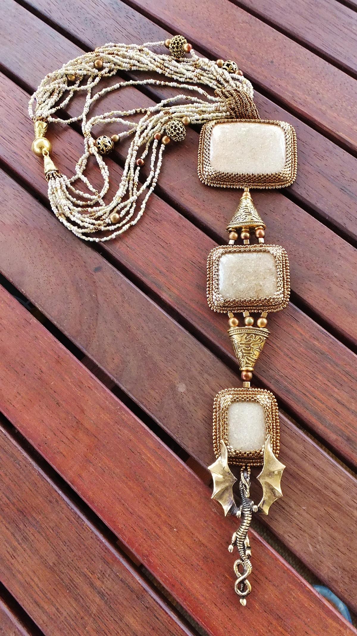 Очень красивые камни. Сразу решила сделать колье галстук. Вроде ничего сложного, только не поверите, каждый камень распарывала по три раза… То стяжка не нравилась, то нитку в конце обнаруживала там где ее не должно быть, и вообще не понятно откуда она там появилась, то бисер вдруг в ряду пропадал и просто мозги закипали куда все исчезло… Когда делала третий камень, то уже даже не психовала… сказано три раза пороть, значит три раза )))) Одним словом характерное колье.