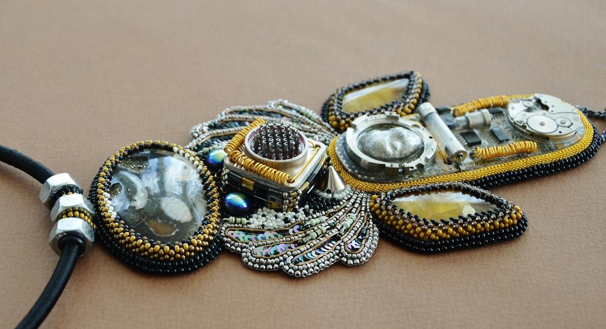 Украшения в стиле стимпанк отличает наличие пружинок, шестерёнок, гирек и гаек, в том числе и штифты, маховики, циферблаты и болты.