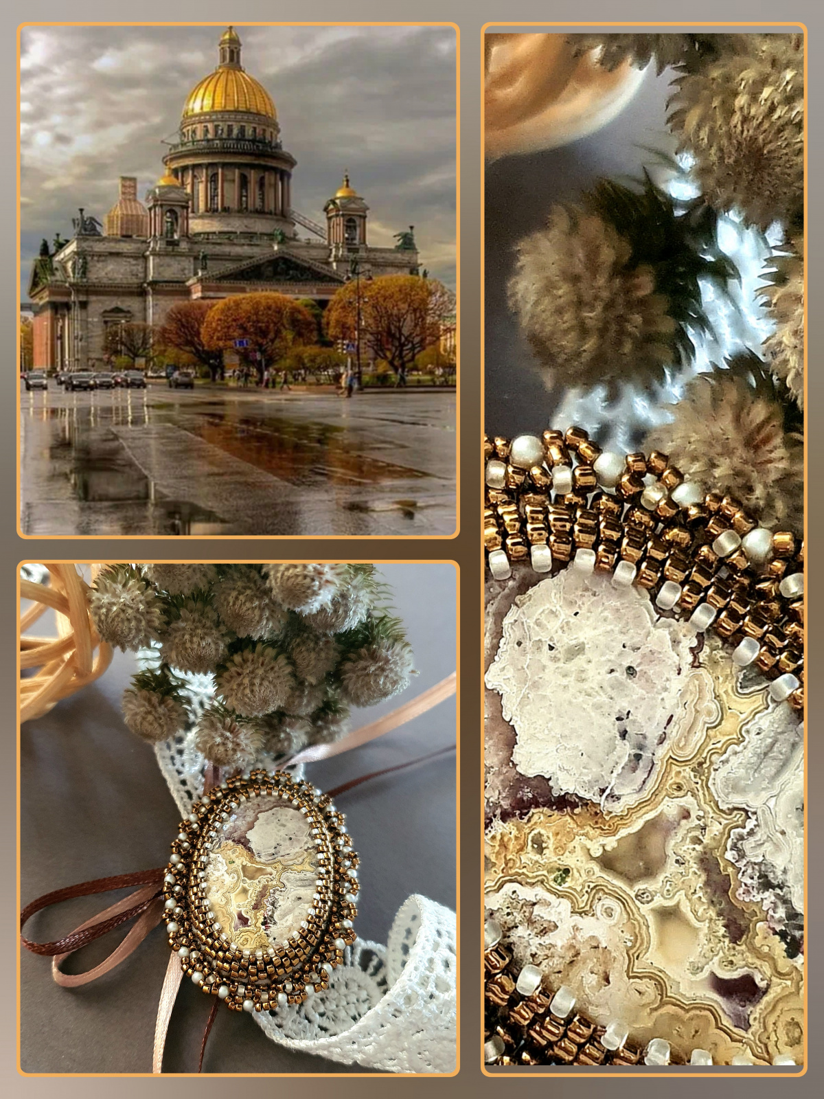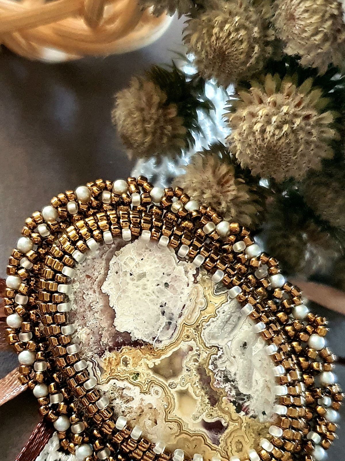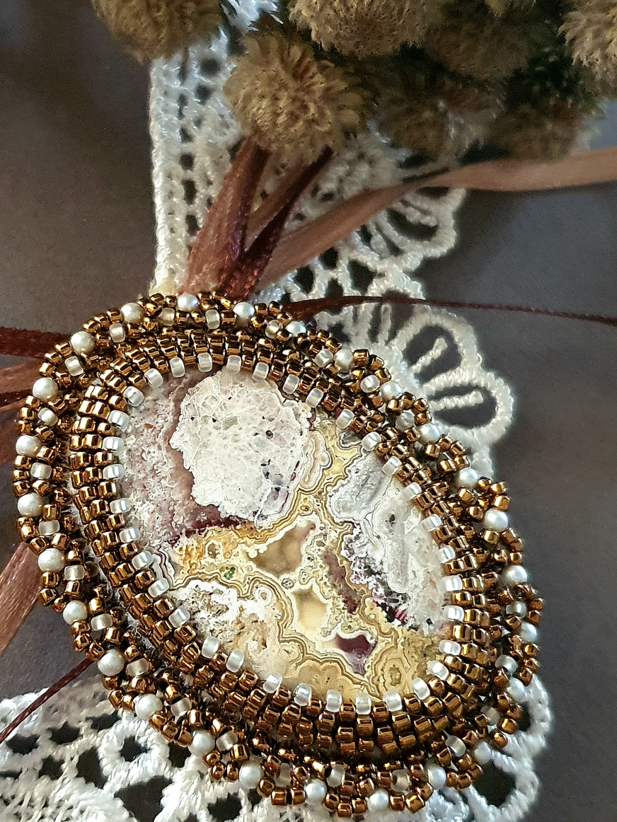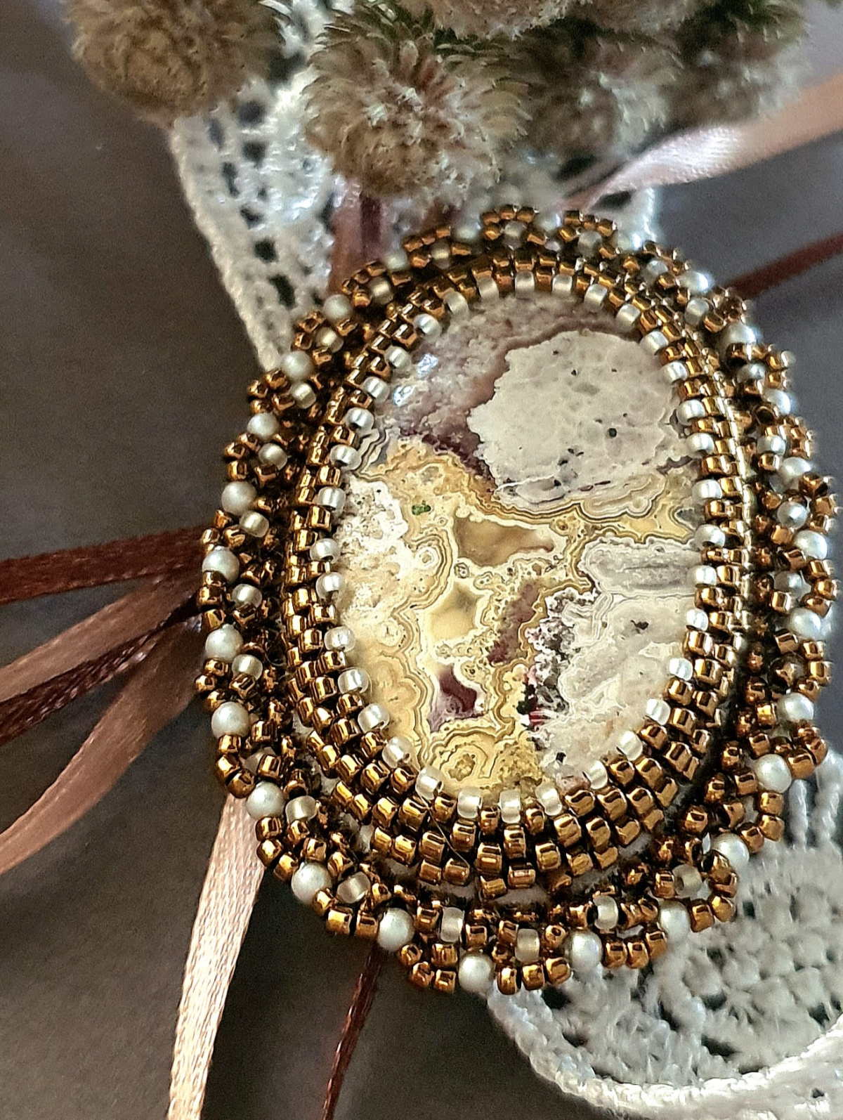 у меня очень, очень много кабошонов, но… надо отобрать самые маленькие.Надо отдать должное Маше, что она очень точно выбрала этот кружевной агат, агат крейзи. Бронзовый японский бисер и матовый сатиновый жемчуг прекрасно дополнили друг друга.