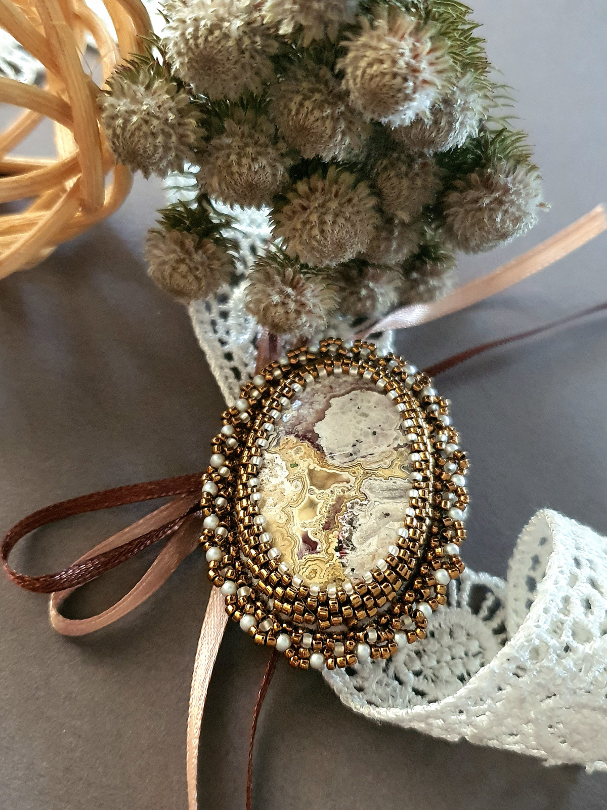 Надо отдать должное Маше, что она очень точно выбрала этот кружевной агат, агат крейзи. Бронзовый японский бисер и матовый сатиновый жемчуг прекрасно дополнили друг друга.