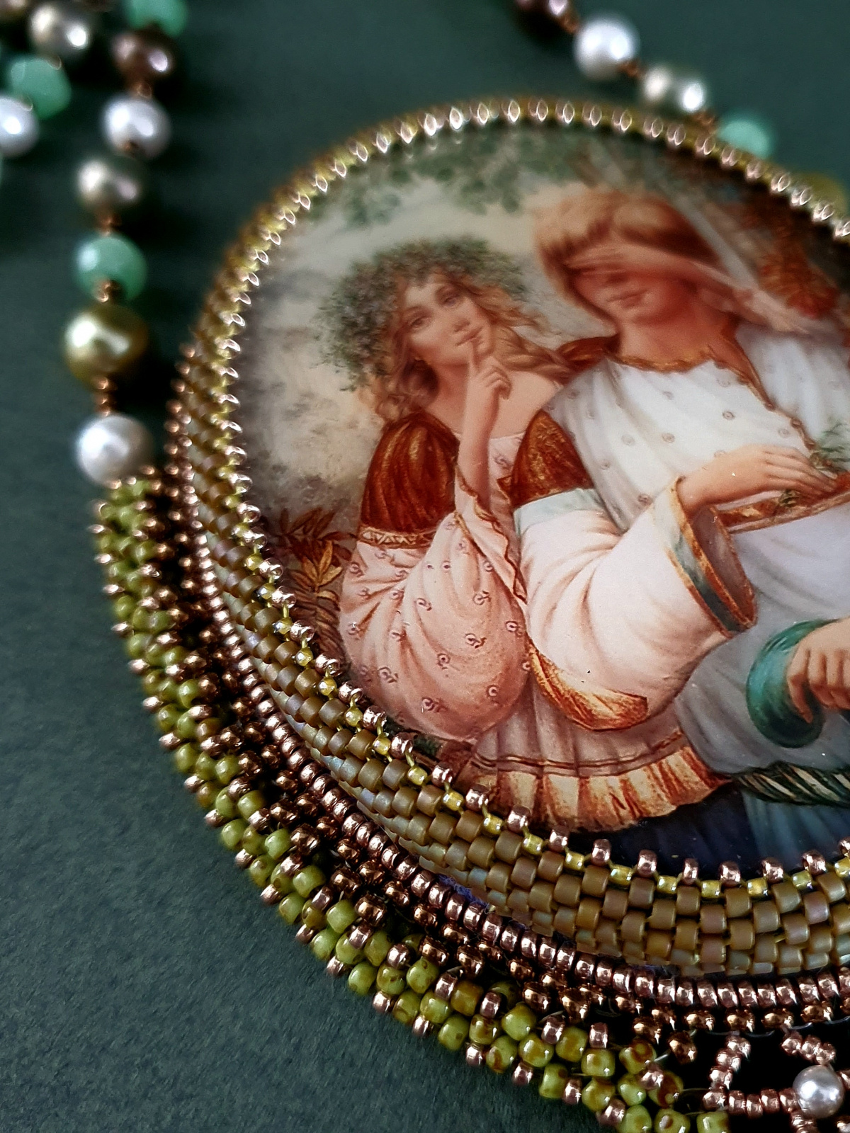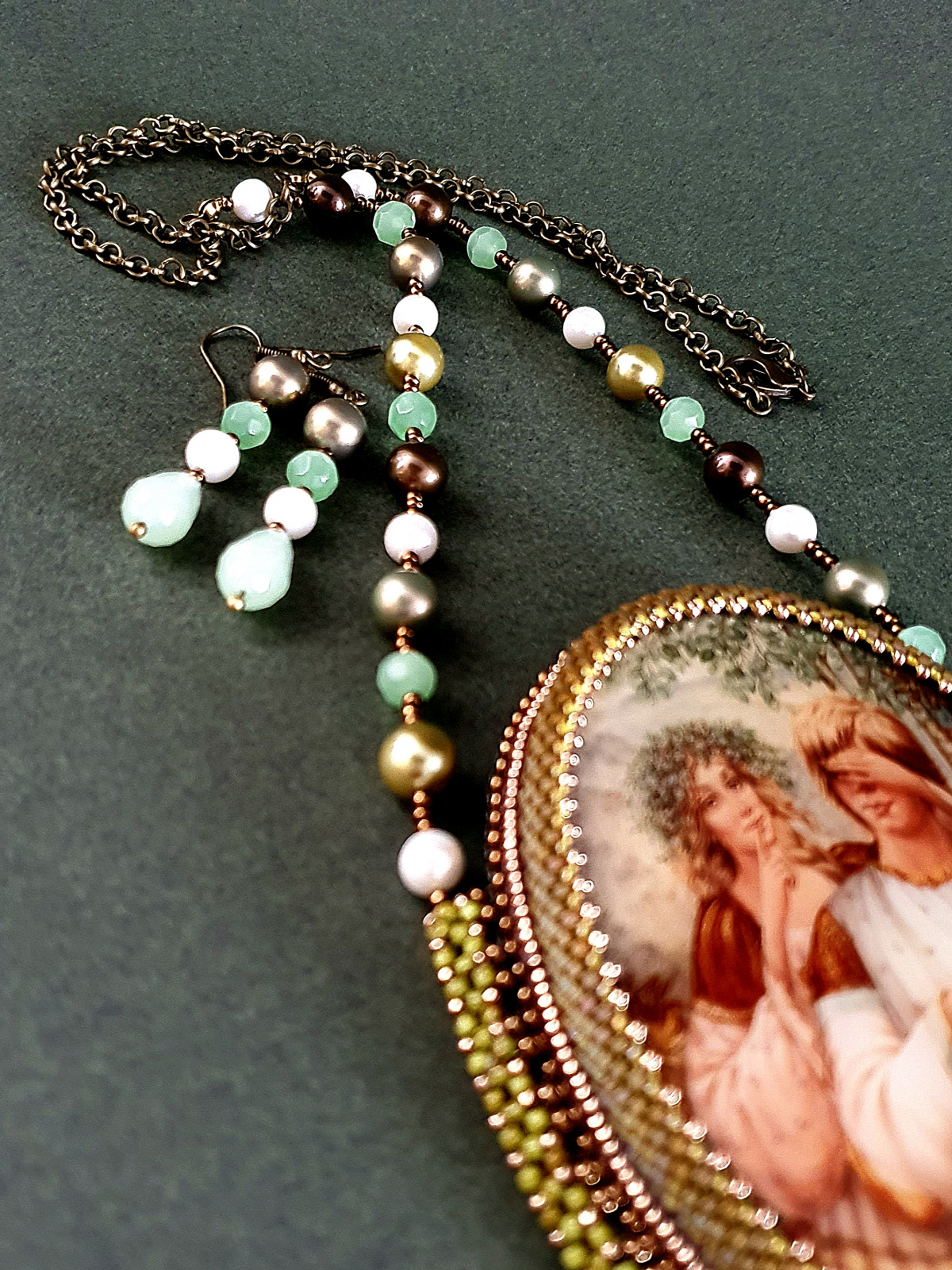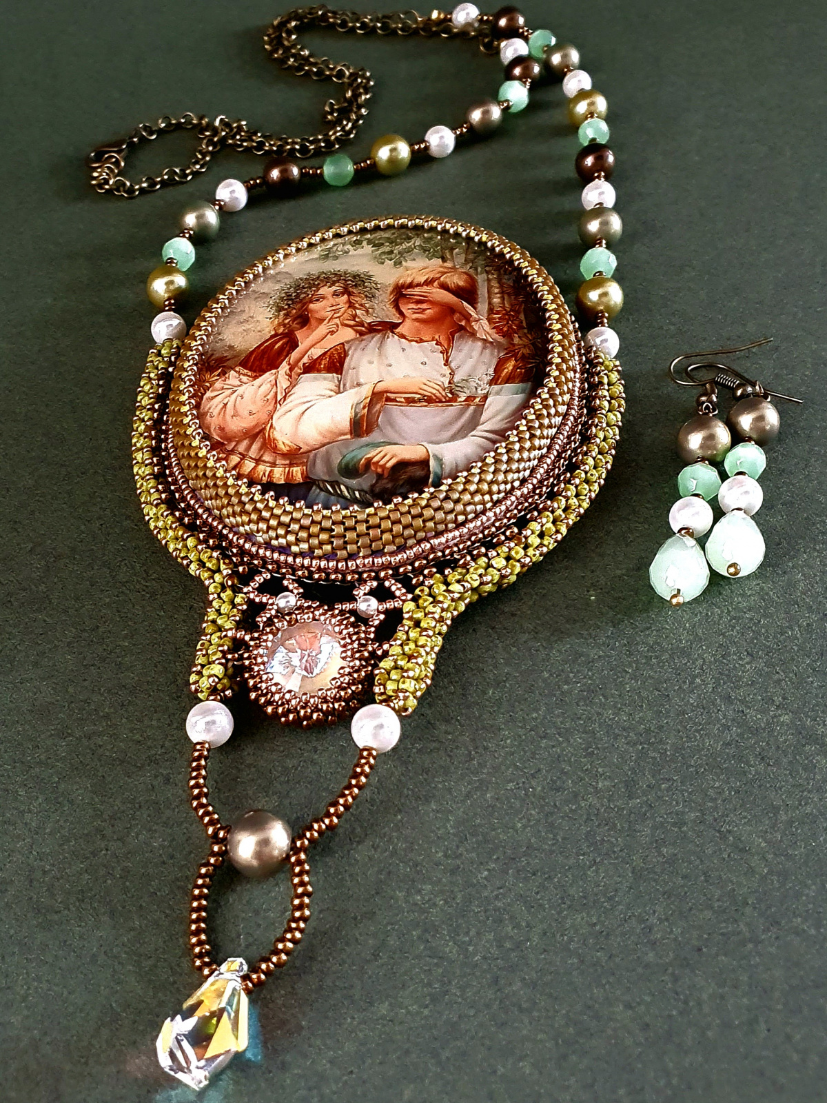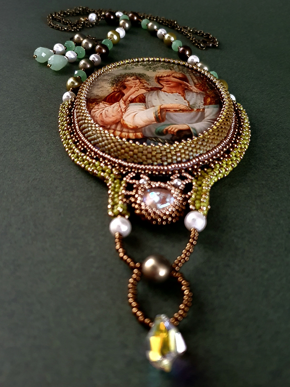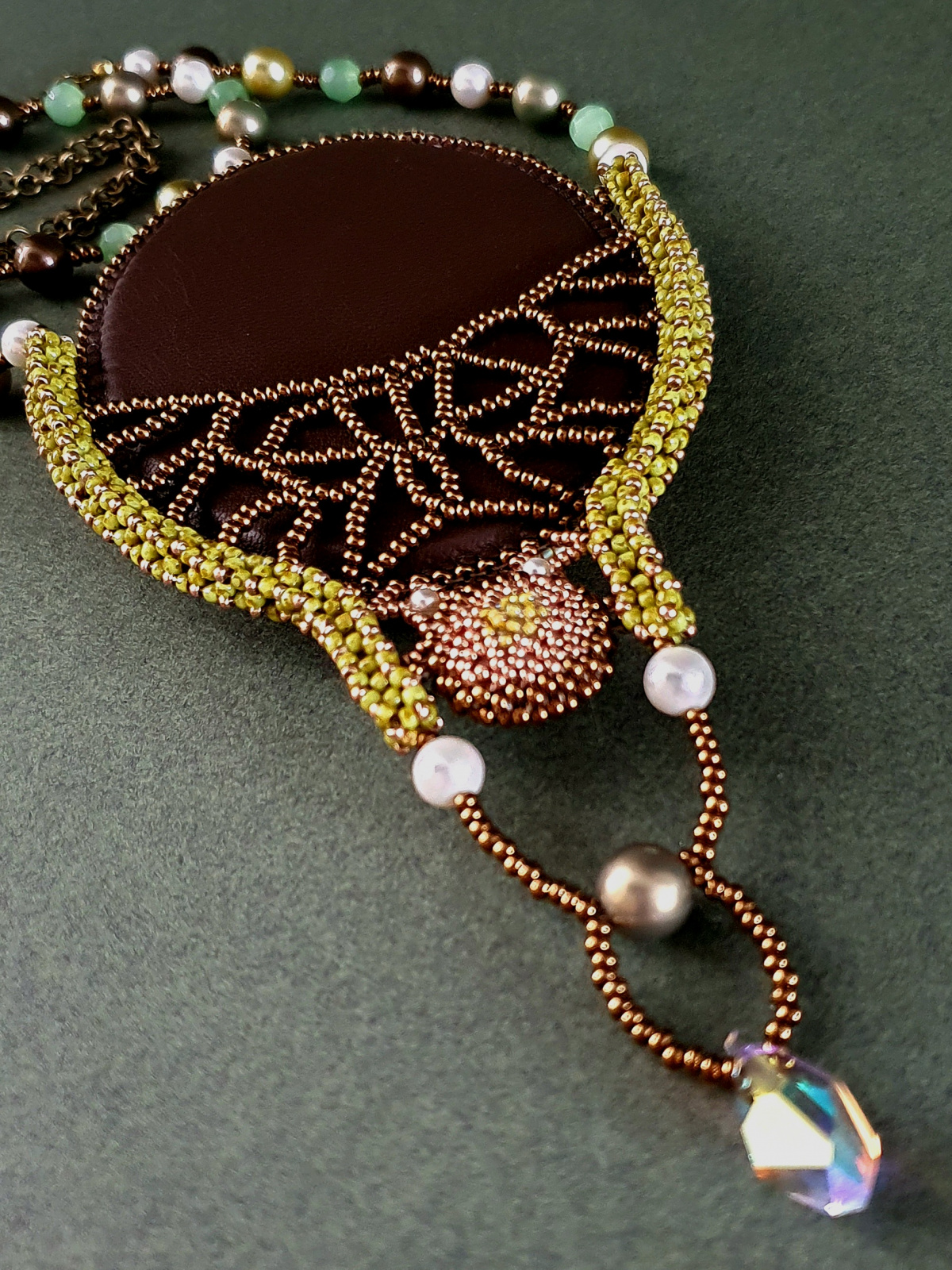 Жемчуг, бусины нефрита, риволи и подвеска австрийского производства. Японский бисер разного размера. По моим подсчетам я использова шесть видов бисера. Изнанка кулона ни в чем не уступает лицу. Все, абсолютно все, в этом кулоне я делала с любовью.