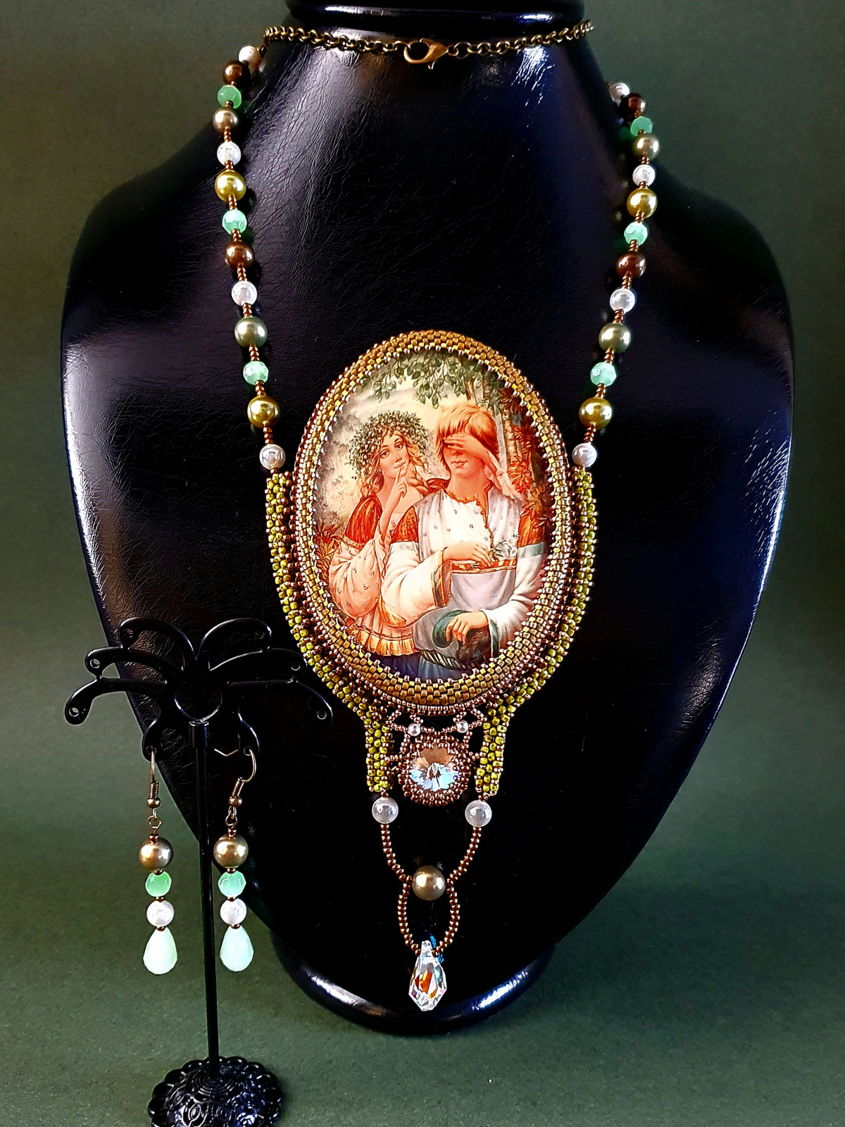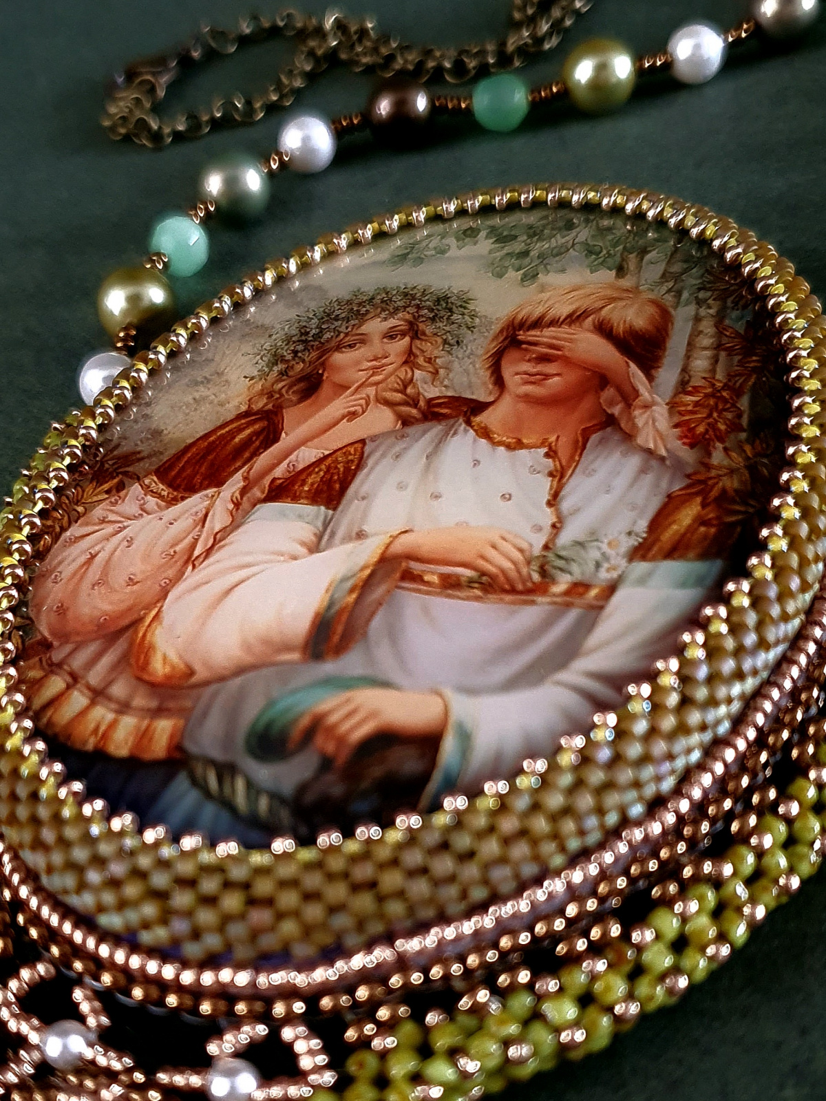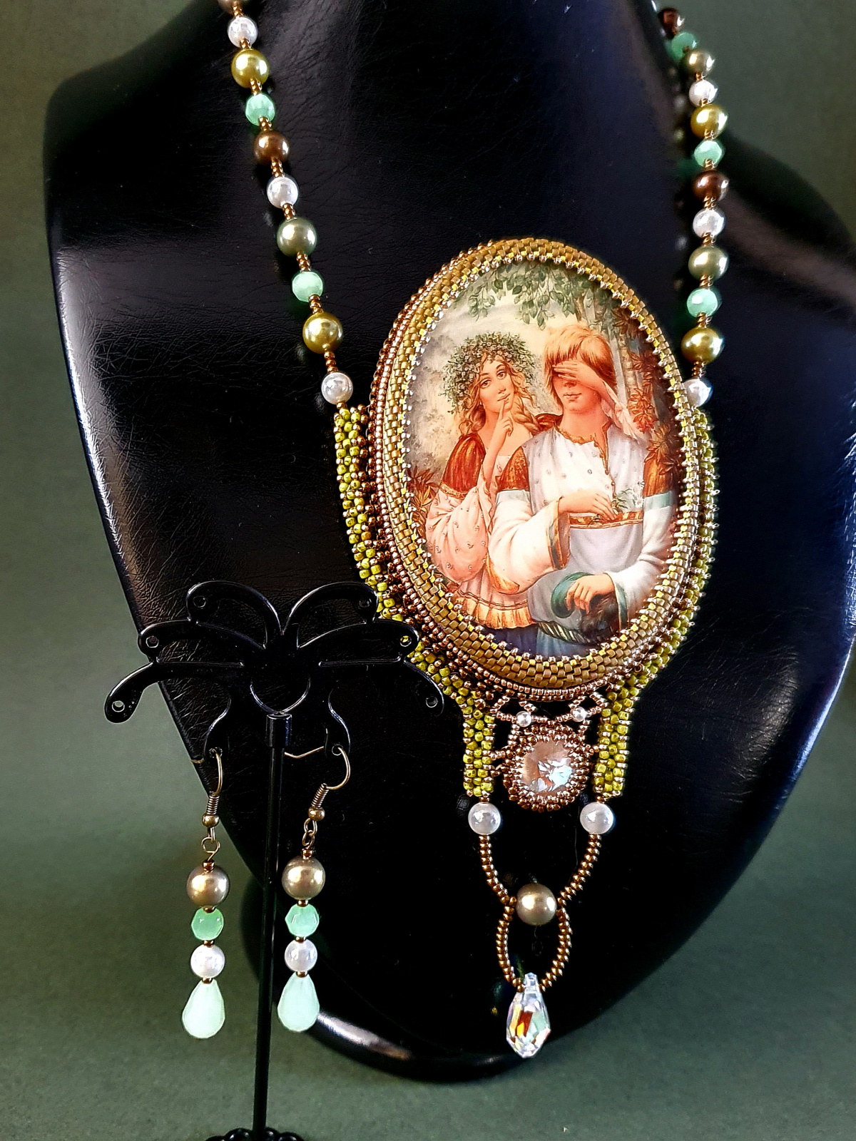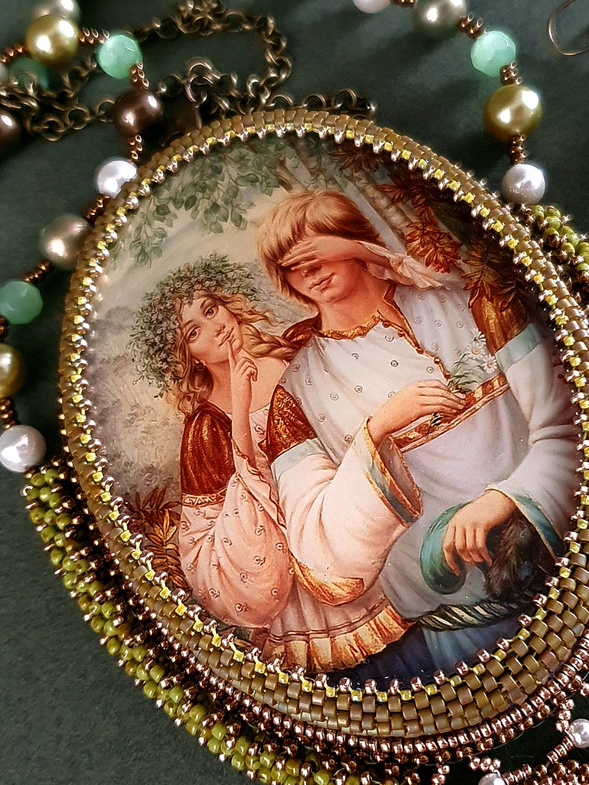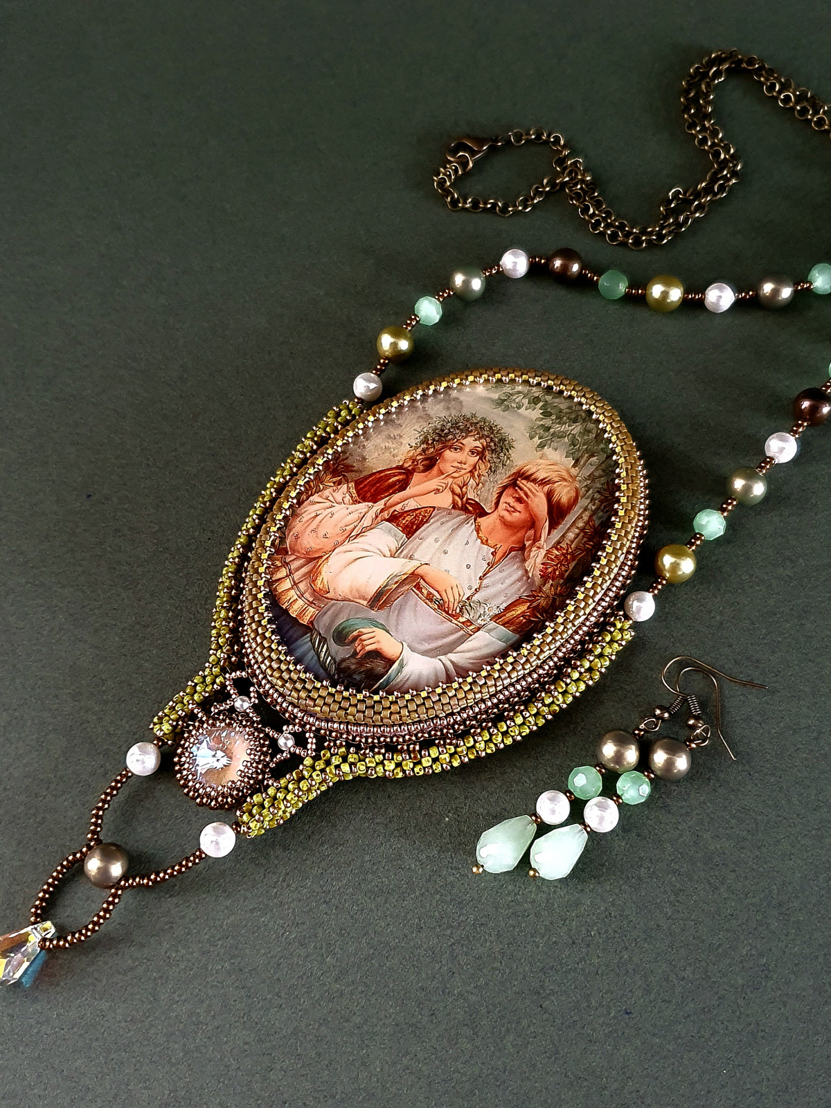 Жемчуг, бусины нефрита, риволи и подвеска австрийского производства. Японский бисер разного размера. По моим подсчетам я использова шесть видов бисера. Изнанка кулона ни в чем не уступает лицу. Все, абсолютно все, в этом кулоне я делала с любовью.