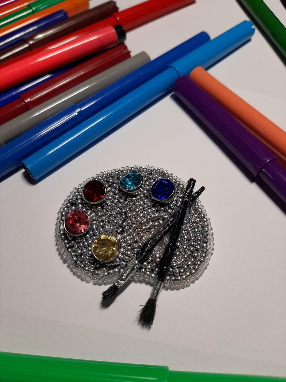 аккурат в самоизоляцию, когда все магазины закрыты были, а запасы, хоть и хомячьи но-«на всю жизнь не напасешься», загорелась дочери моей подруги брошку-палитру,(она сама художник, отлично рисует и архитектор талантливый)картинку прислала… А у меня страз разноцветных и нету, пока суд да дело, только недавно обзавелась более менее подходящими и вот сегодня брошка родилась… Сразу скажу-от картинки отличается, ибо я не мастер, и кстати-чья брошь на картинке? Признавайтесь? Есть у нас этот мастер на сайте??