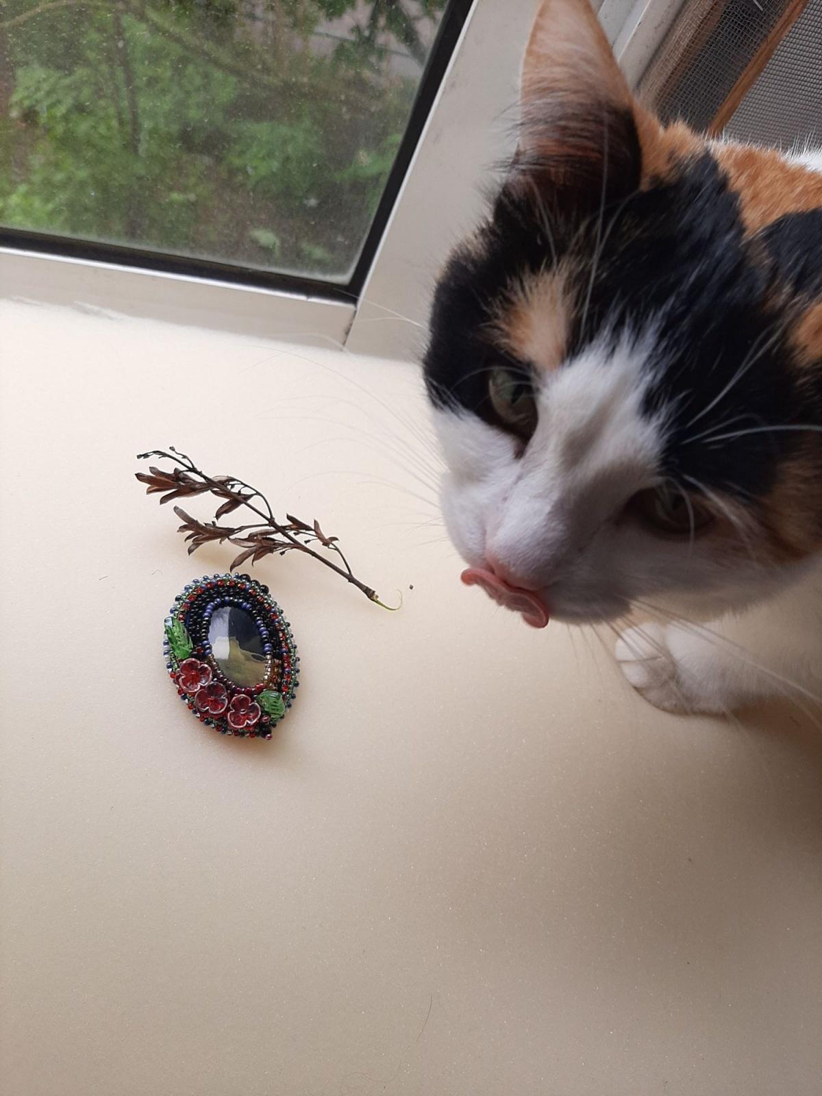Яшма попалась такая зловещая, с четкими переходами, а тут еще старую песню «Я и ты» М Распутиной из фильма услышала… и понеслось… Еще заделочного ряда не шила, а у брошки уже хозяйка нашлась! ну и Луша, поганка, со всех сторон обсмотрела, облиза хвостатая