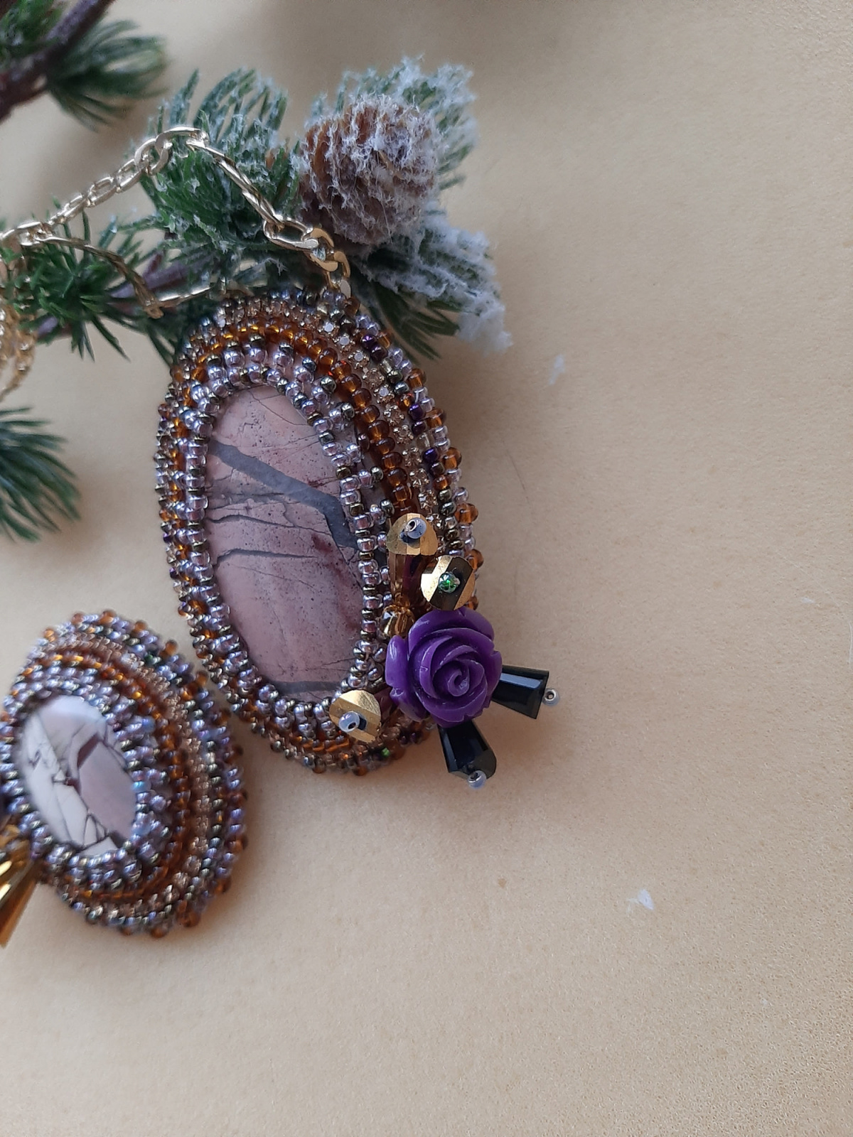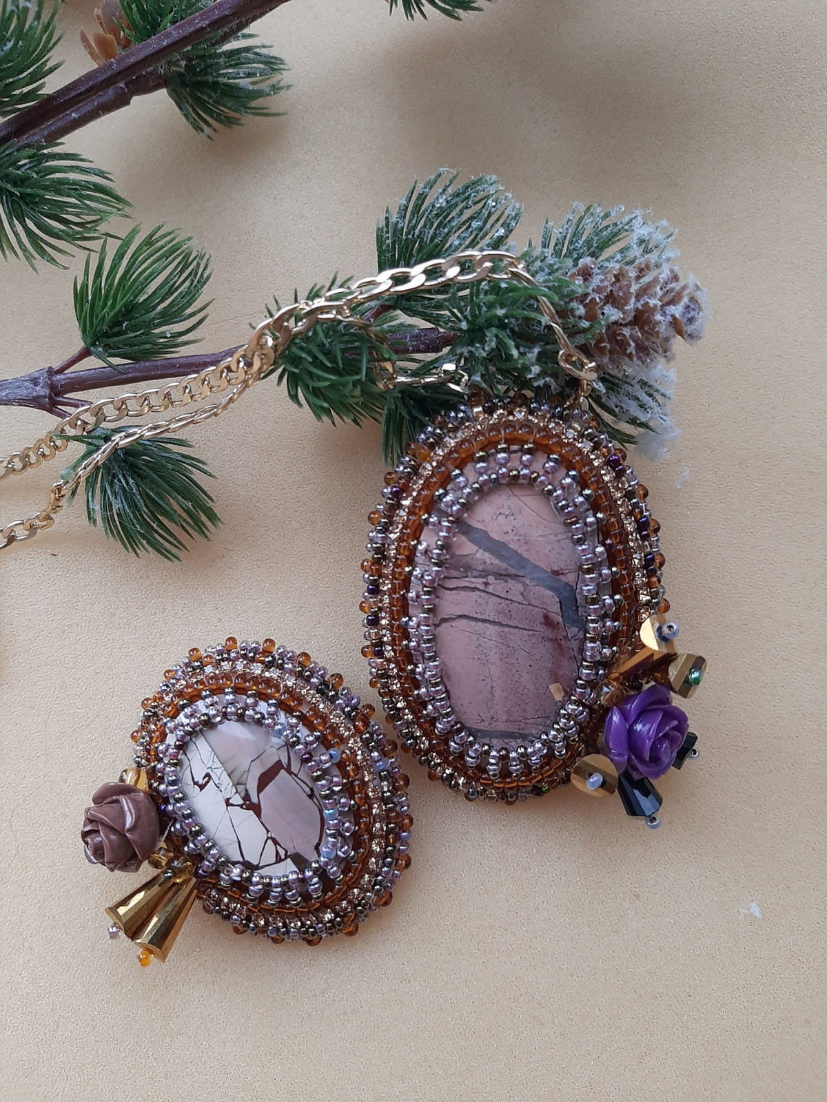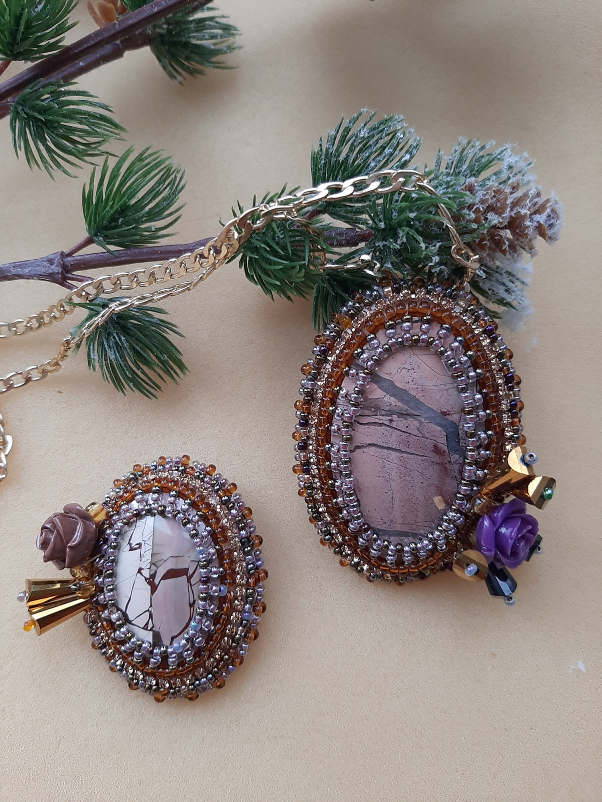 изначально планировался кулон-галстук с двумя этими яшмами, но потом подумали и решили, что кулон и брошь можно и вместе и по отдельности носить, сделала два изделия, это подарок на новый год будет