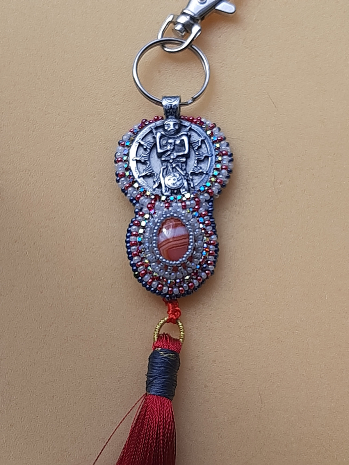 Медальон-оберег Сварог немного модернизировался и украсился, перемычку для подвеса «откусить» кусачками не удалось(ну вот на фига довольно дохлой пластине такой мощный крепеж), сделала так, племяннику в подарок, на ключи или в машину подвесит, он подобное любит