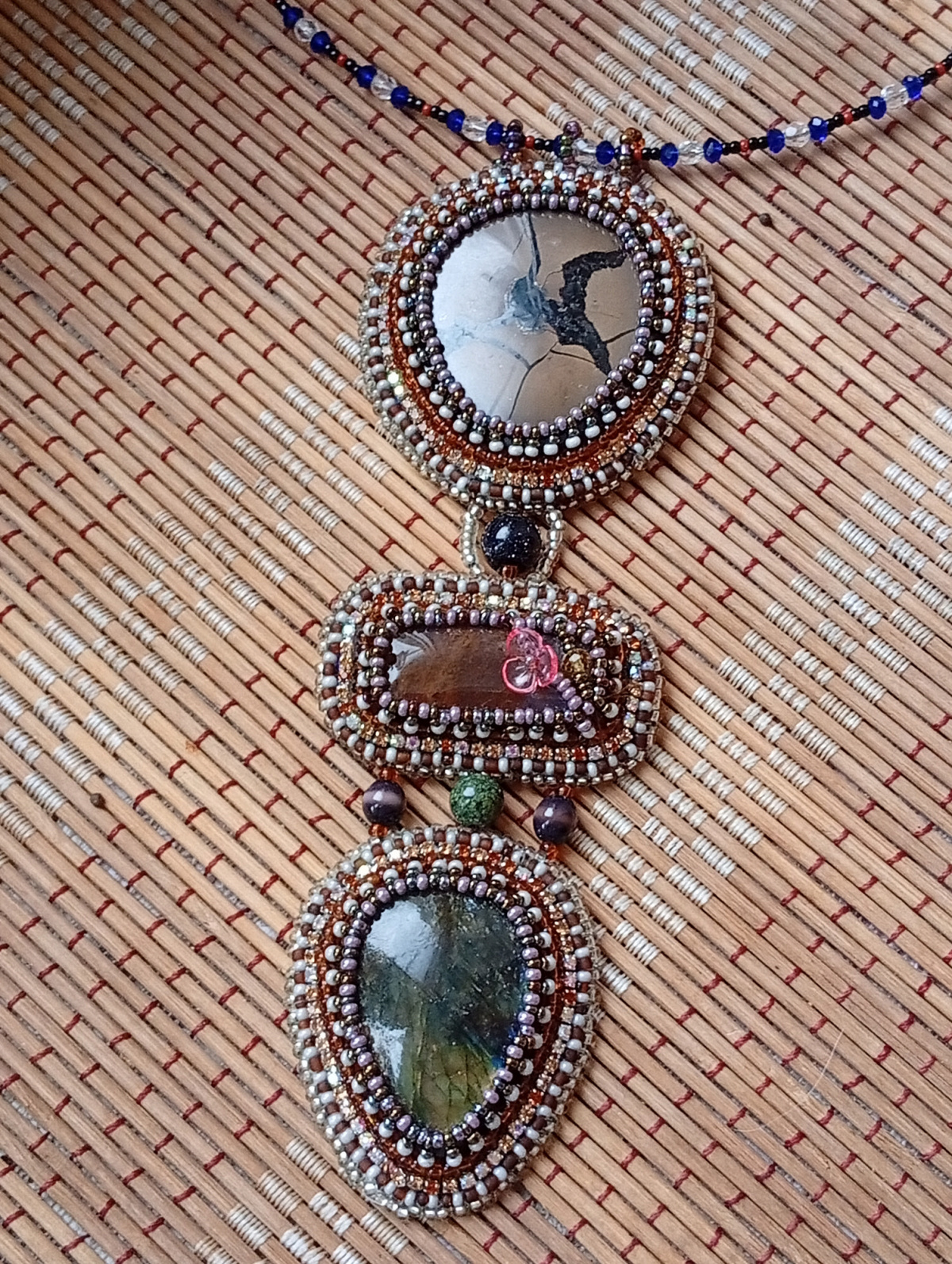 Давно зрела идея чего-то подобного, вот наконец, срослось, камни-септария, яшма, спектролит совсершенно чумового окраса(он один у меня, себе оставлю), погода дрянь, нормально не сфоткаешь, но солнца можно долго ждать, поэтому что получилось