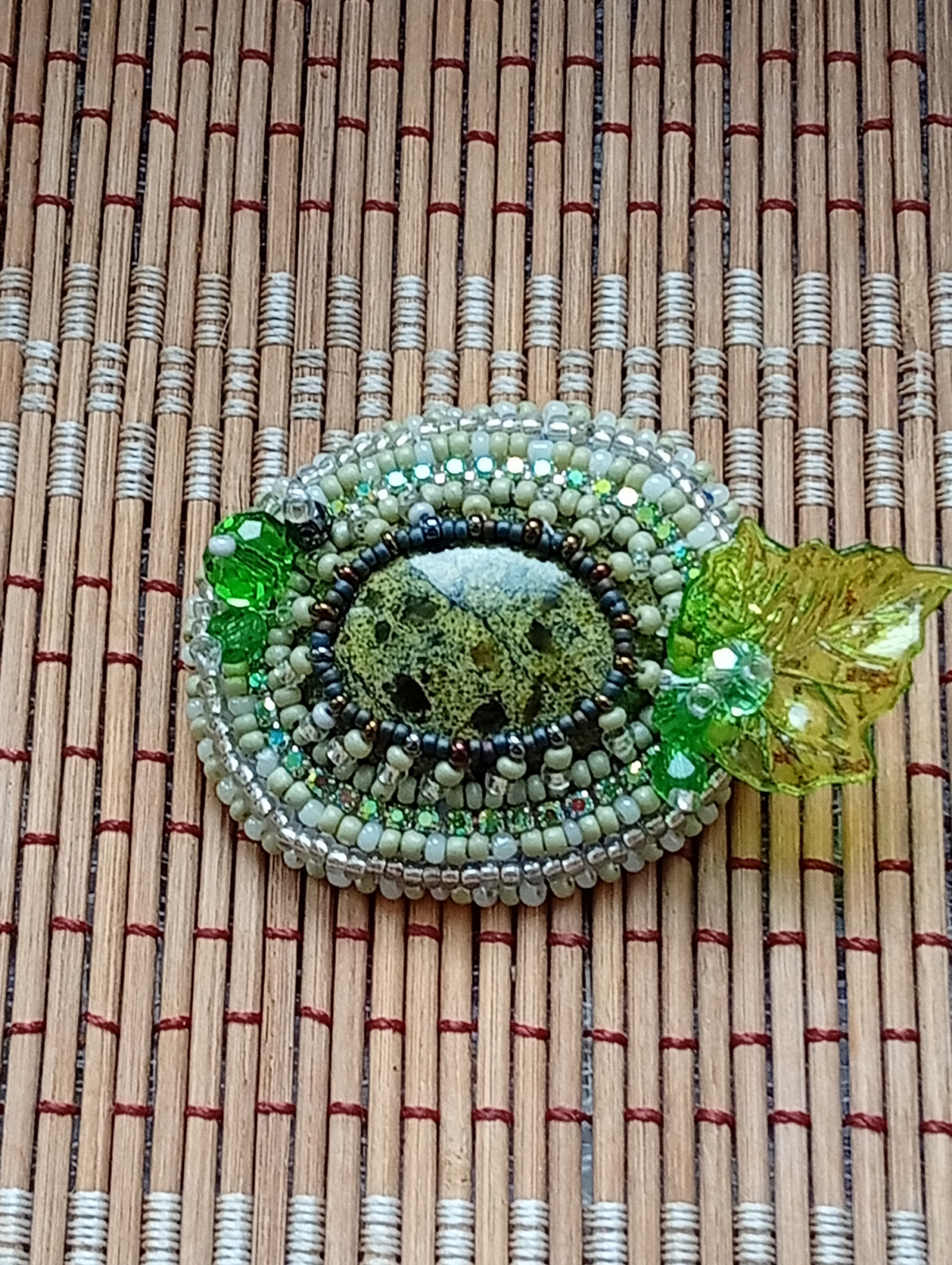 небольшая зелененькая брошечка, легкомысленная и воздушная, пластиковый листик этому способствует, камень-всем известный змеевик, очень его люблю
