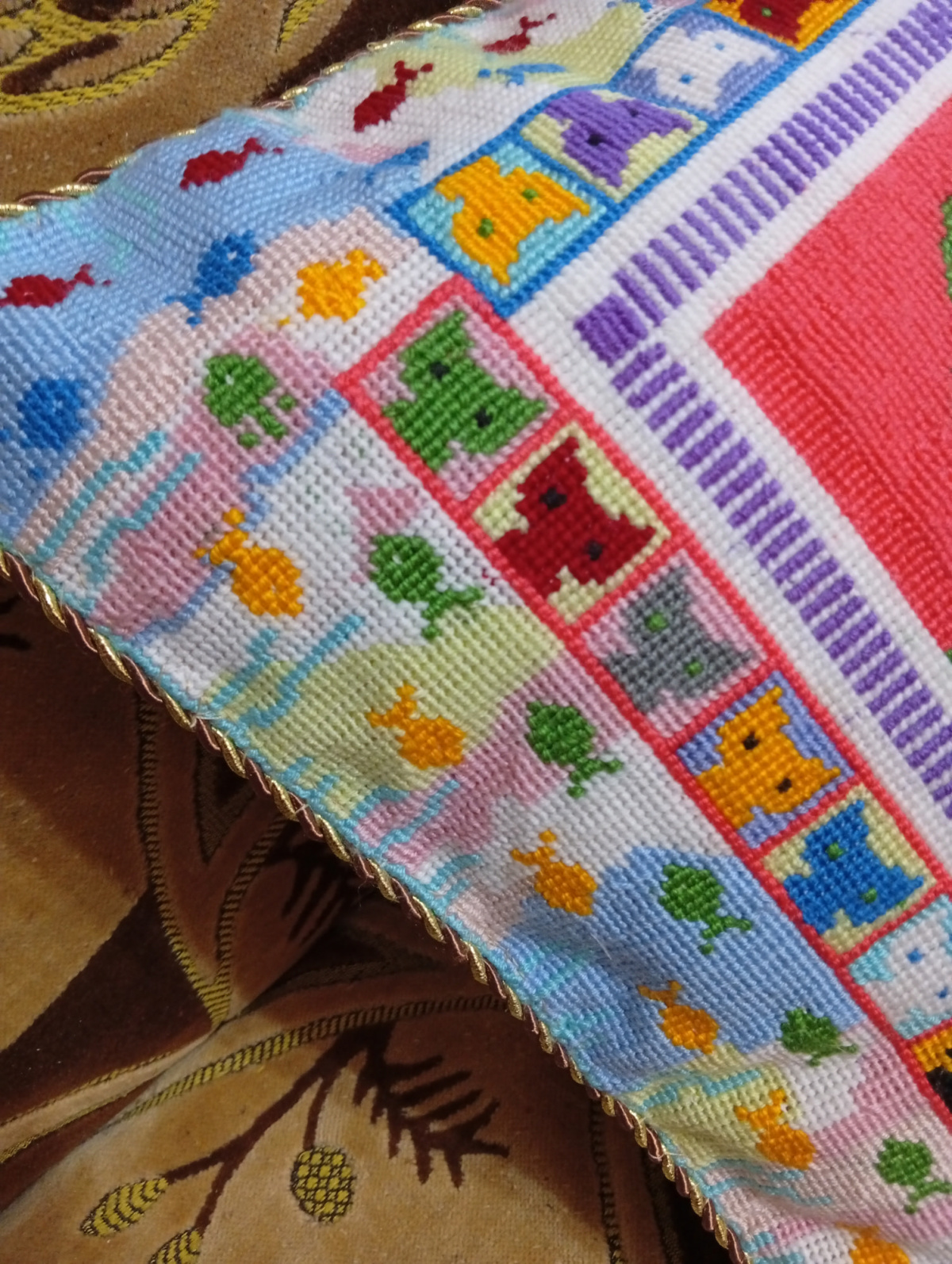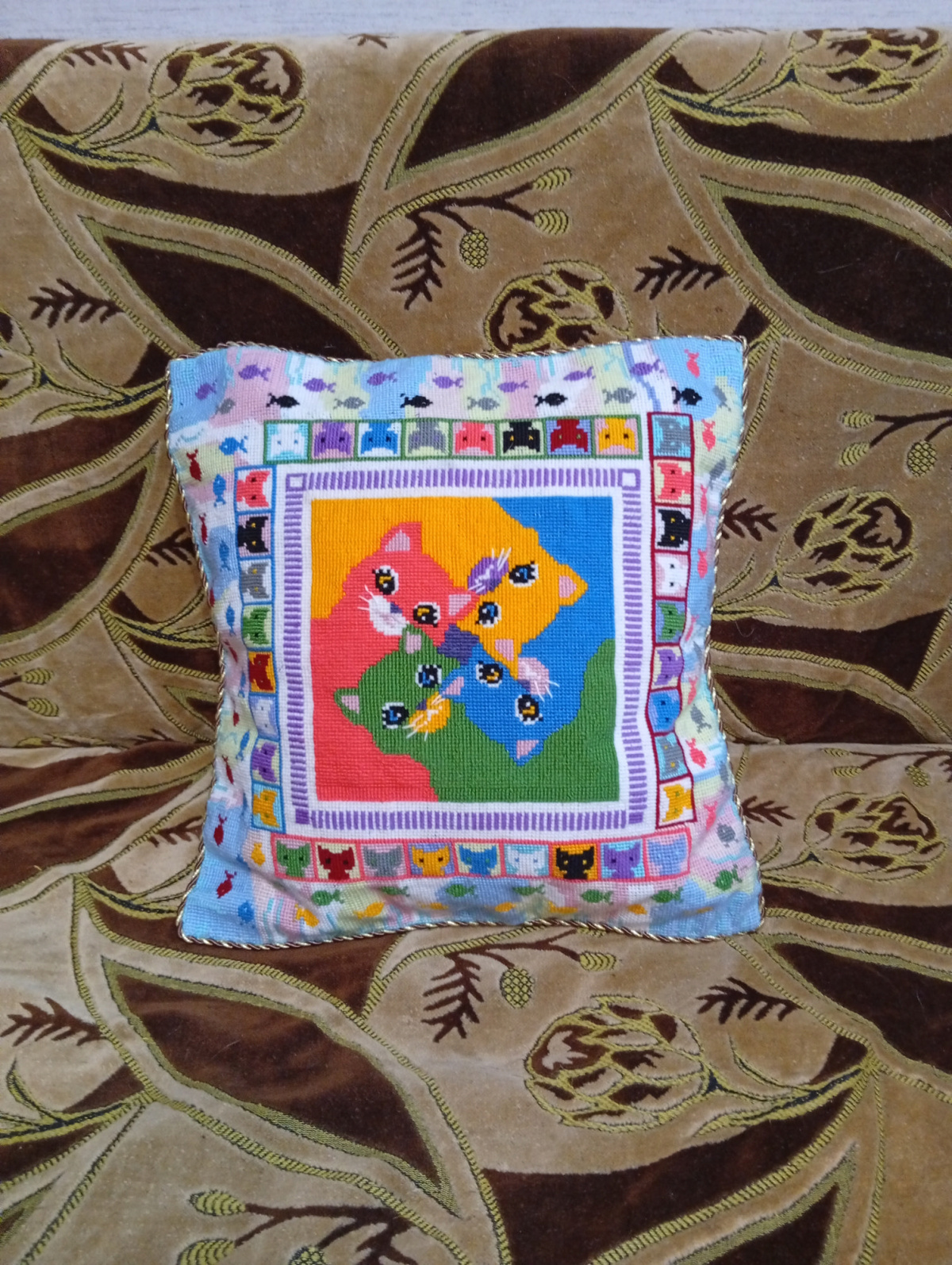 и, наконец, закончила котоподушку,2 месяца мучений, больше на таком страмине вышивать не буду, проще было взять 10 канву, размер 48 на 48, нитки-акрил, изнанка-мягкая флиска, в целом-результатом я довольна