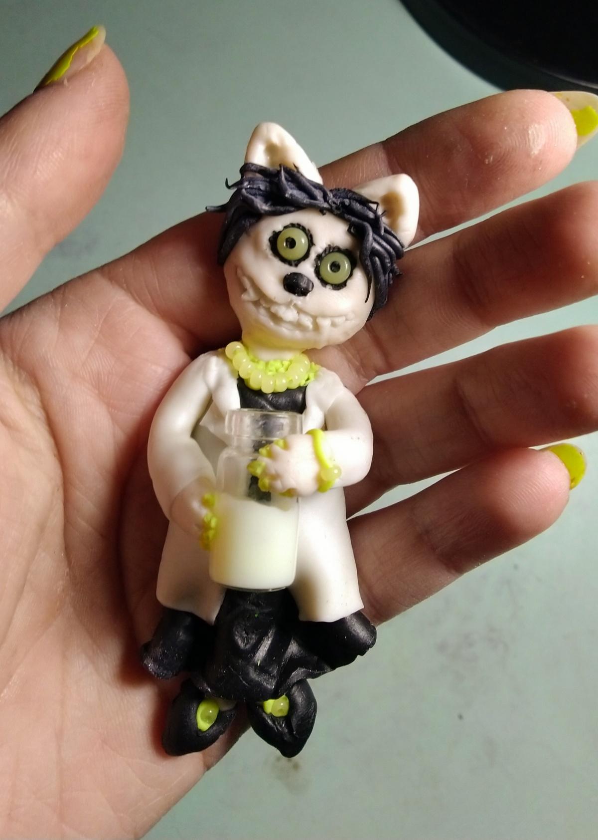 Думала у меня ничего кошачьего нет, а потом вспомнила! Есть! У меня есть котобусины из полимерной глины и браслеты с ними! И автопортрет — кошечка с банкой люминофора)))