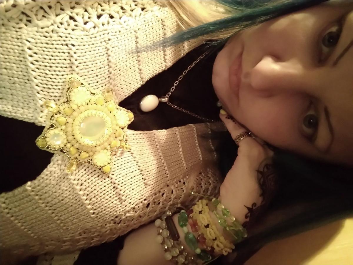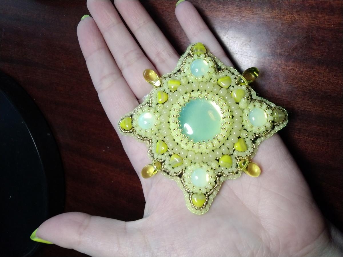 Что мне здесь нравится: носибельность — хоть на платье (можно и застежкой к поясу), хоть на верхнюю одежду и будет эффектно смотреться и на улице и в помещении. Форма классическая — не надоест. Интересно смотрится неурановая 15-ка — как маком посыпано — такие конопушки Похоже, что и нитки флуоресцентные?