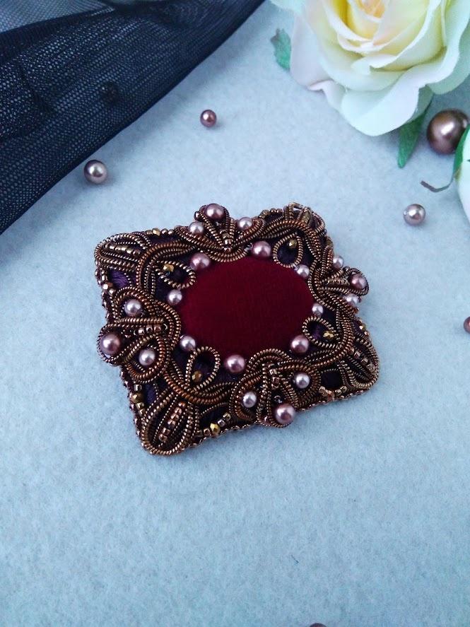 А эта брошь — очень необычный заказ. Её хозяйка — председатель совета ветеранов завода. Мои броши ей нравятся, но ни кристаллов, ни камней, ни блеска ей не хотелось. Говорит: " Не в моем возрасте". Придумали компромисс — обтянула кабошон бархатом. Канитель бронзовых оттенков, жемчуг известного бренда))) Самое необычное и непривычное — форма — прямоугольник. Не знаю, как вам, а мне нраааавится)