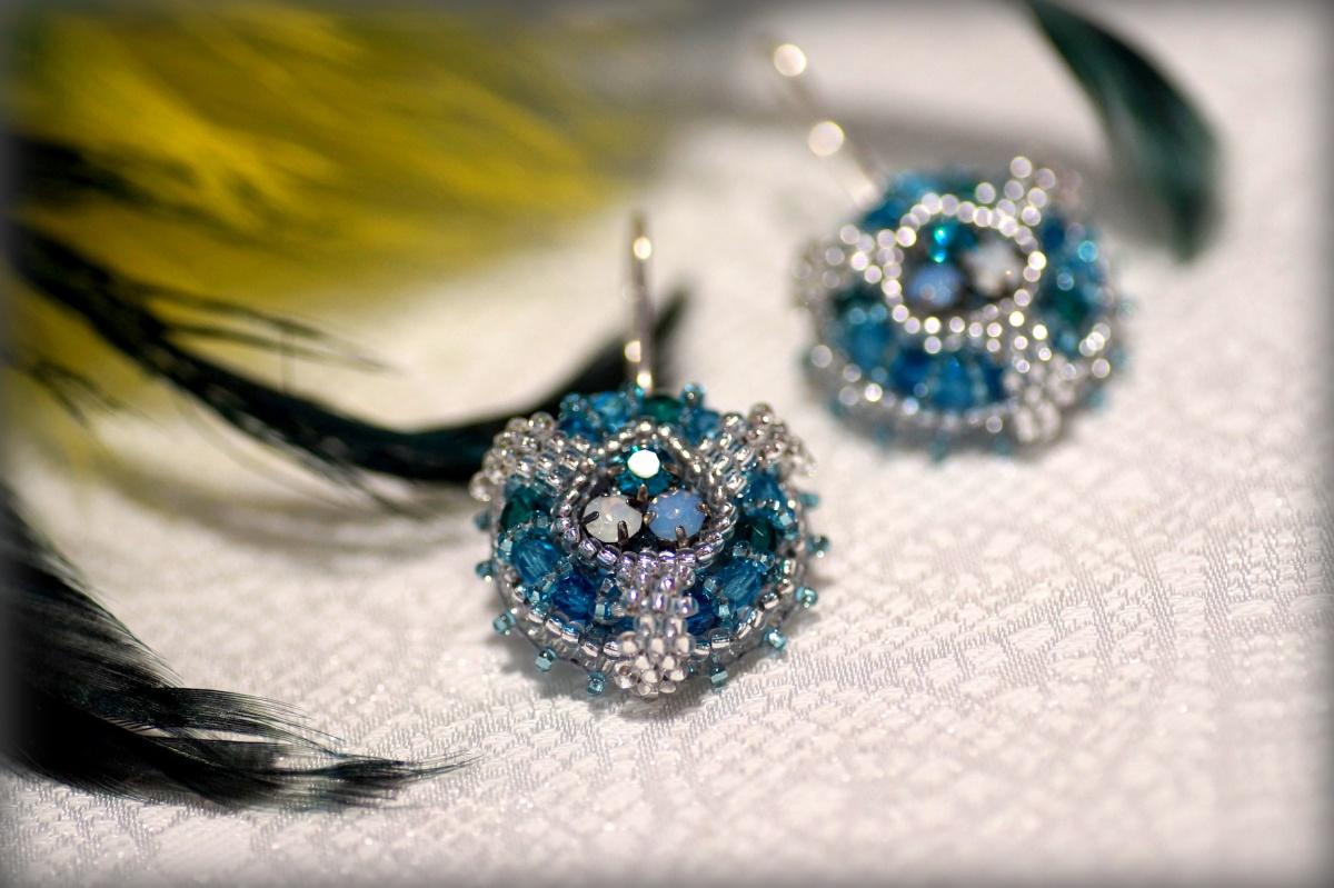 Заказчица захотела на подобие прошлой моей работы но в другом цвете. Но я ж не люблю делать одно и тоже )) потому под предлогом что материалы другие у меня, предложила ей другой вариант. А как начала делать… так сама на себя ворчала. Вроде мелочь, а времени как на колье ушло. Переделывала тучу раз. То блестящее до жути, то холодные какие то, то как дешевка-китайская… Цель была — голубые. И кристалл вроде так с голубой нотой. Но оказался он ближе и бирюзе (зеленит). И соответственно подходили только бусинки в изумрудных тонах. В итоге я сочетала синие зеленые и голубые бусинки. Итог мне прям очень-очень понравился