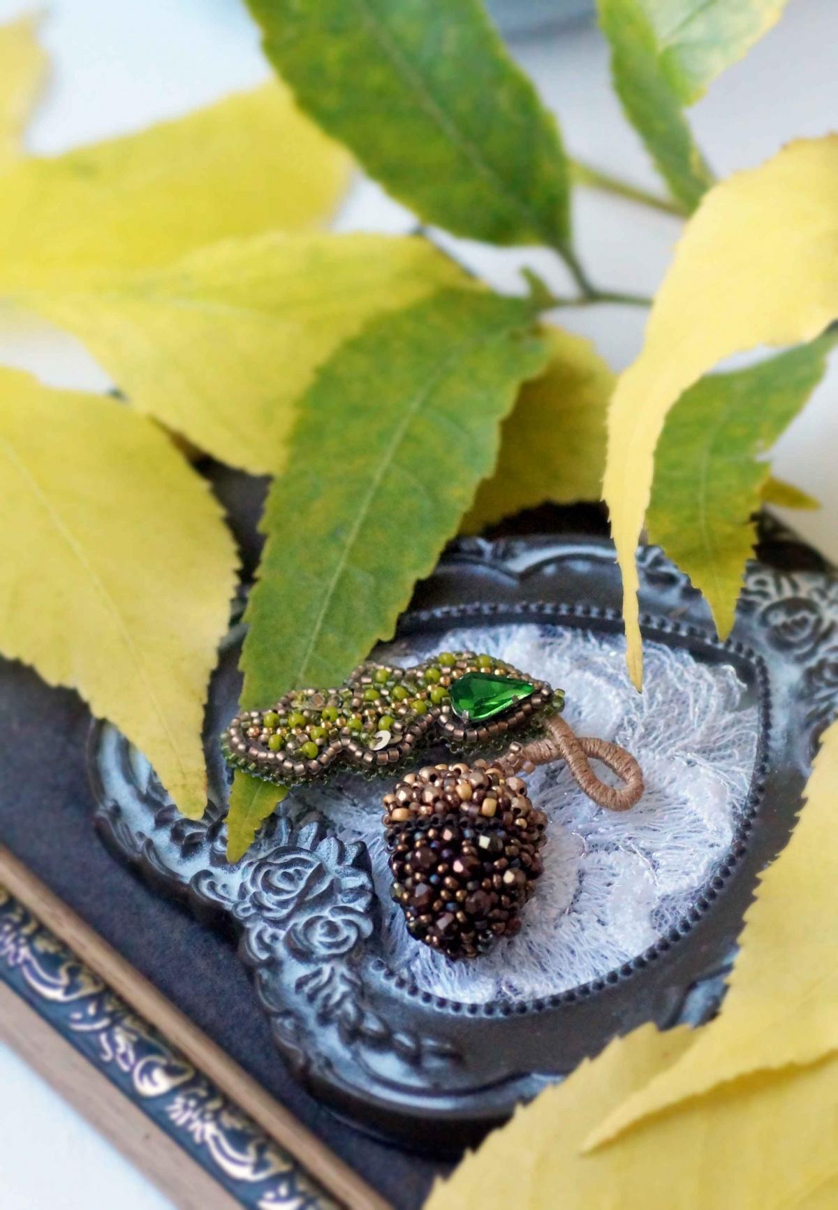 Брошечка не большая совсем и легкая. Листочек в длинну 4см, а желудь — 2см. А соединяет их вот такая вот веточка