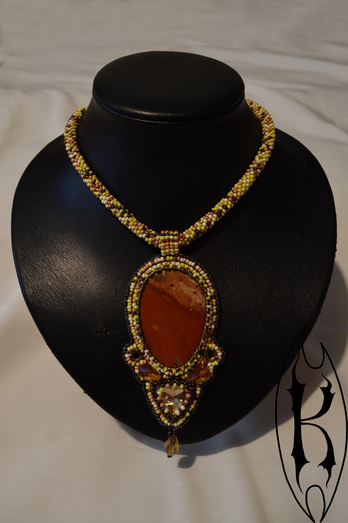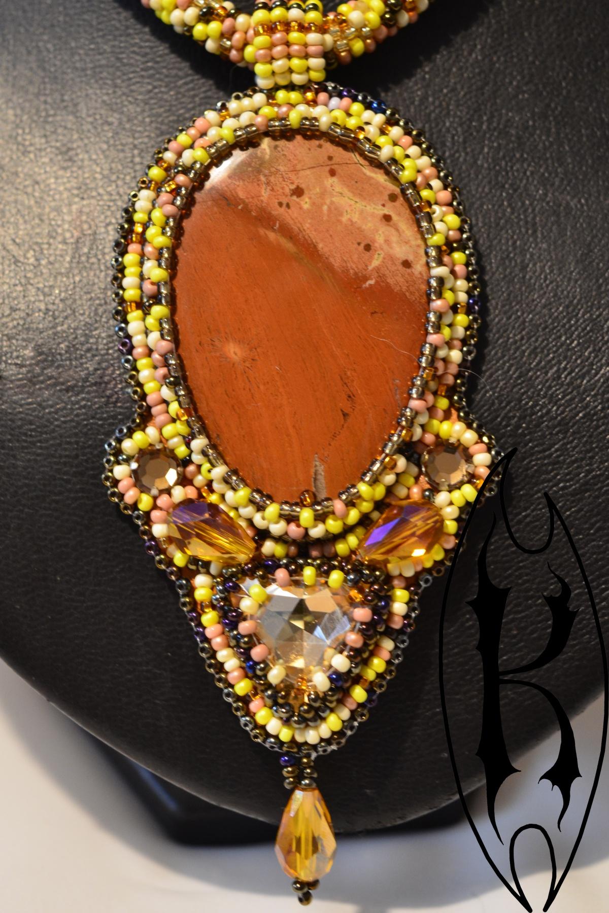 Следующая яшма. Точнее она была вышита первой. И получился вот такой кулон. Планируются еще серьги с треугольными стразами… когда нибудь потом)))