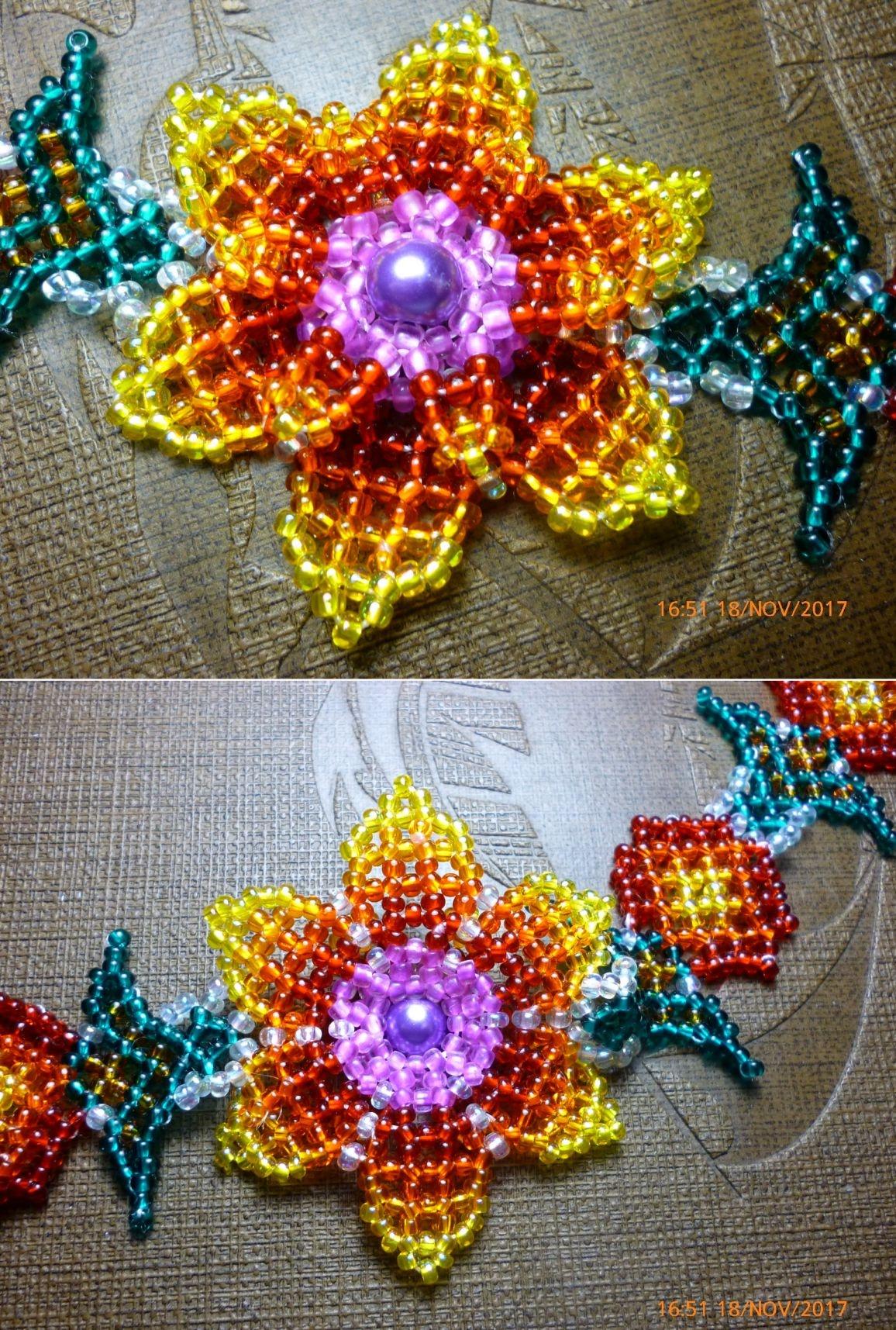 А второй соединяет в себе, по сути, все мои достижения в названной манере плетения, приправленные не в меру разгулявшимися фантазиями. Главная фантазия: использование исключительно прозрачного бисера, чистых тонов, без всяких напылений и прокрасок, внутренних и внешних. Увы, облажалась с сиреневым в серединке цветка