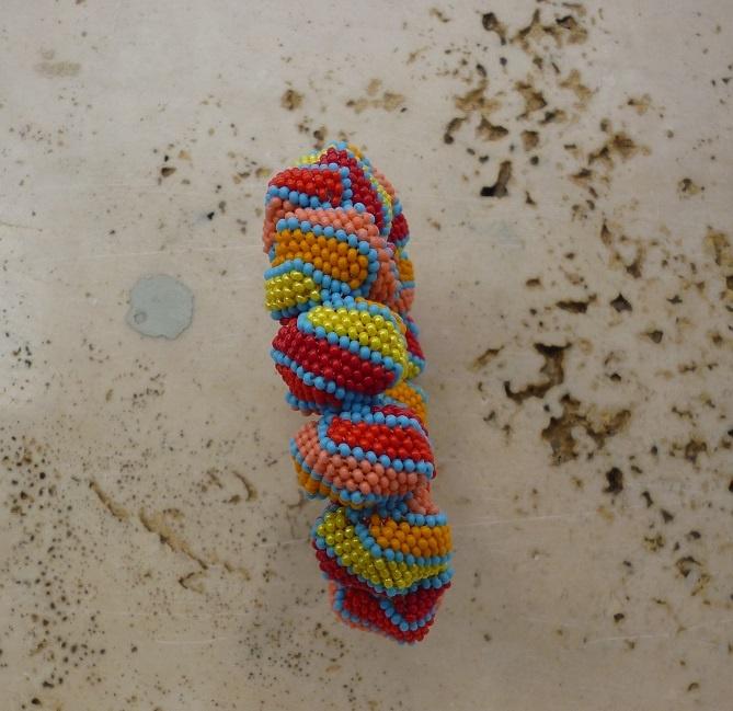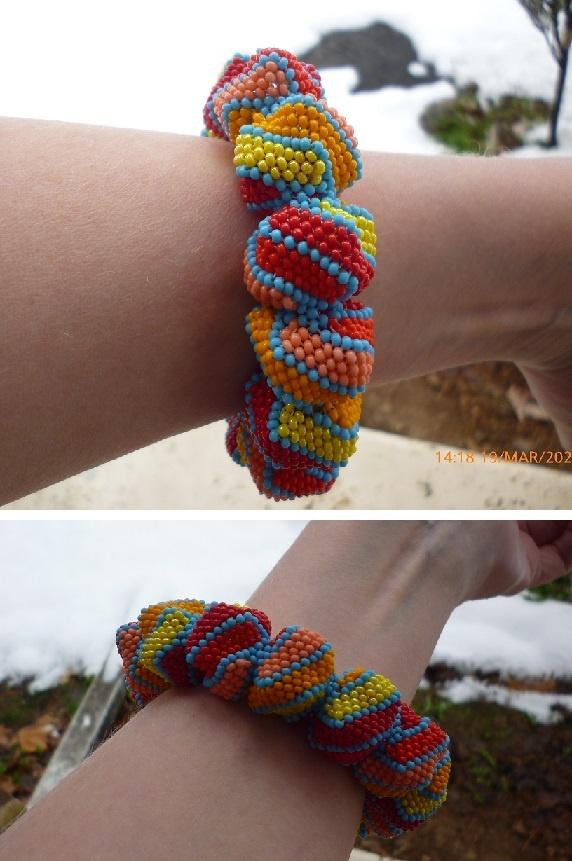 Из особенностей — ну очень долго плести! Мне пришлось. Результат порадовал, а муж ворчит, дескать, не очень ему нравицо… круглый, пестрый, неизящный… Ну а мне — так очень и очень! Еще и по размеру удался. Фоток много, не шибко правда, удачные, но цвета вроде примерно такие и есть. Бисер 11, местный. Нейлоновая нитка.