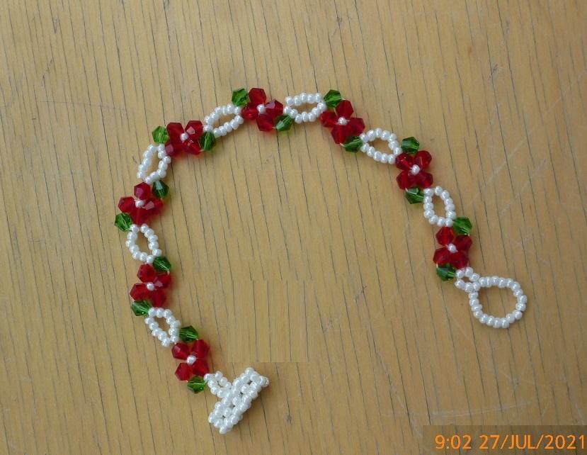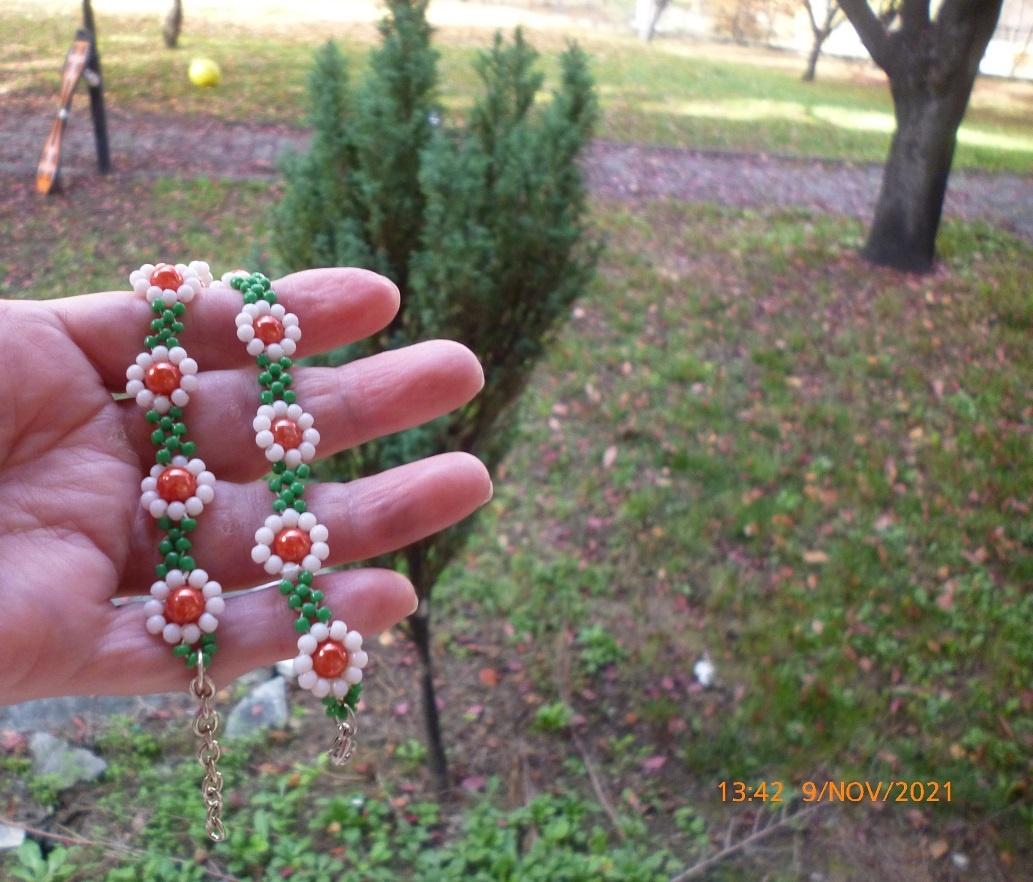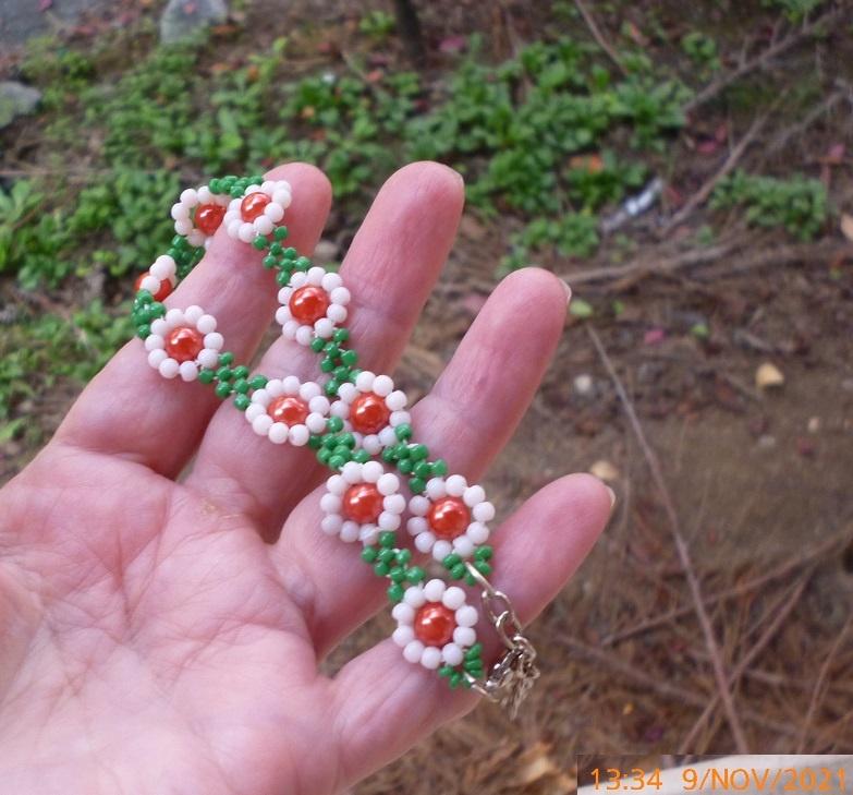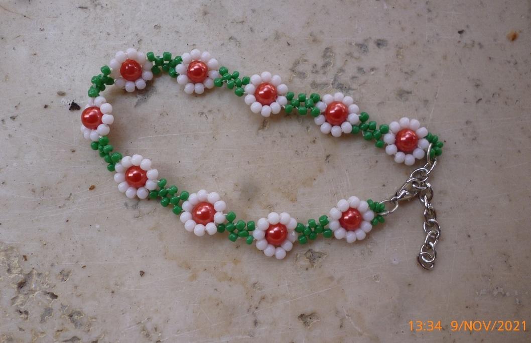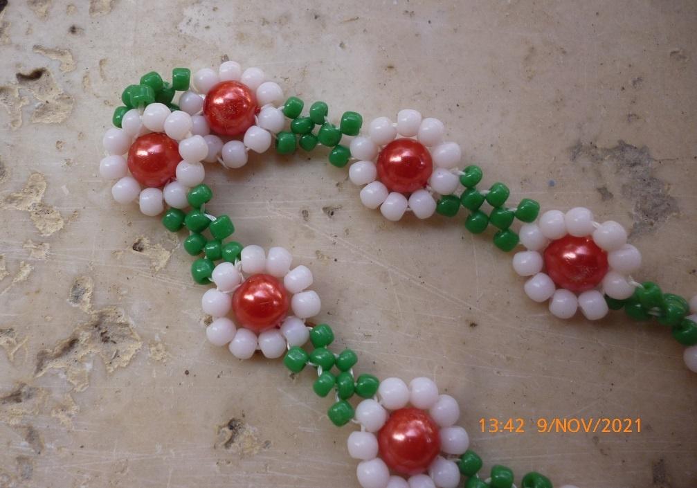Здесь зеленый — тщательно откалиброванный китаец, а белые — мелкие белые бусинки. И цветочек обводила полный круг еще раз, а то все «течет».