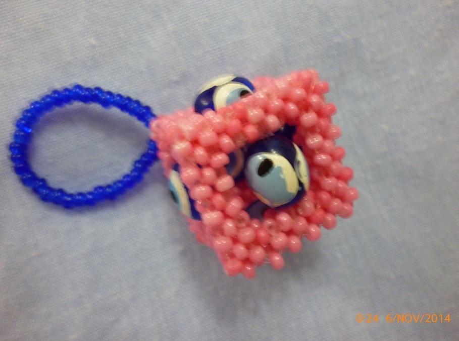 Добавлю эту работу, она давнишняя, чуть ли не первый опыт игры с квадратным шнуром. Вдозновившись чьии-то шедеврами, сляпала свой с «назар-бончуками» — глазастыми местными бусинками. Кубик приглянулся приятелю сына, когда он к нам как-то приехал, он и прихватизировал сию психоделическую (© его же) вещицу. Мне осталось три фотки… И я из не вижу в альбоме, посему кладу сейчас.
