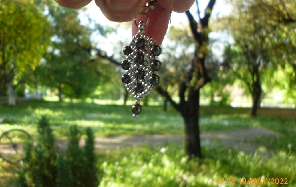 Правда, и бусинки эти такие тяжеленькие… но все же, думаю, стекло.Видео-МК здесь (но там внимание! Мастер предлагает сперва плести половинку сережки, а вторую — уже новой ниткой. Мне такое не очень подходит, но сразу не посмотрела ролит от и до, и в середине был нежданчик… Посему предупреждаю спразу. )