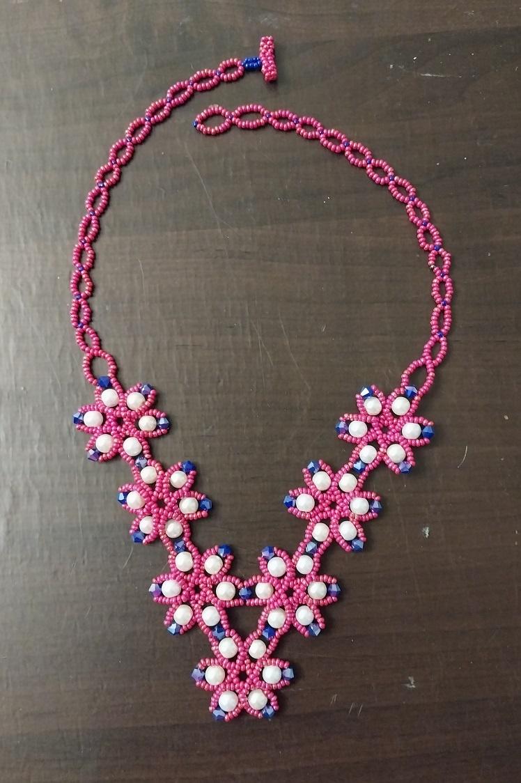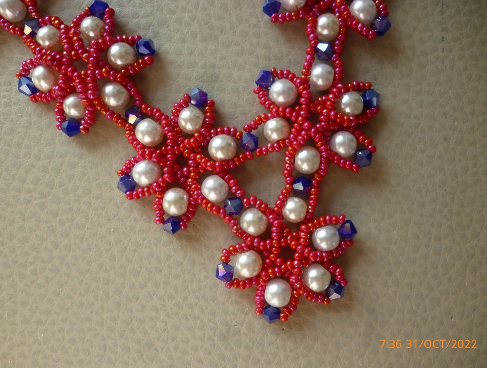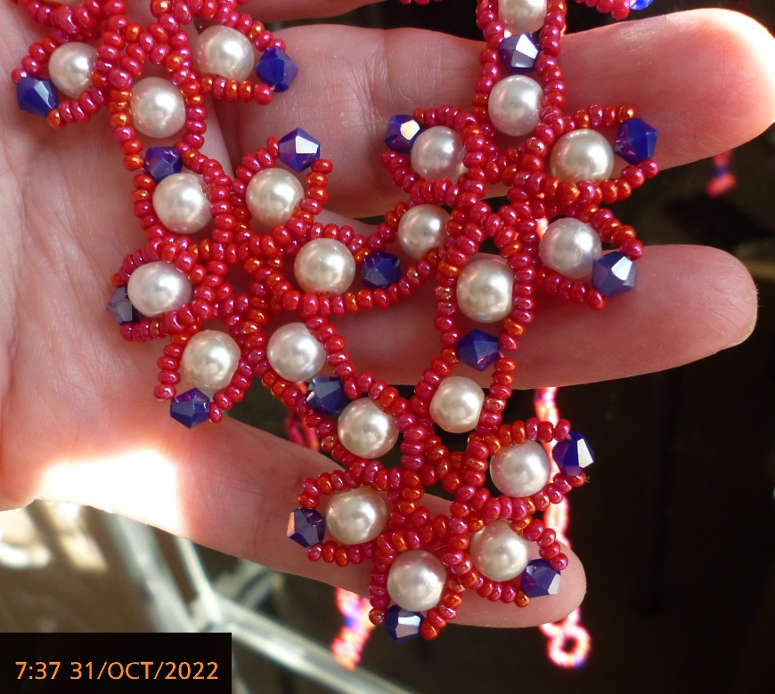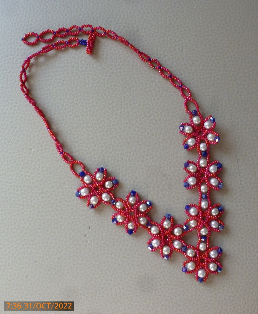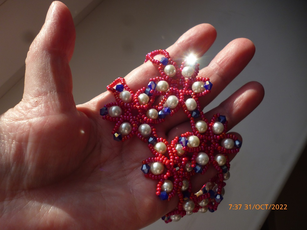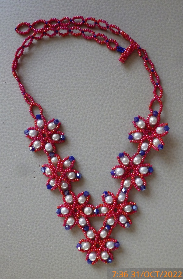 Цветы, правда, скорее бело-синие — из-за бусин и темно-синих биконусов. Но общий цвет (как впечатение) то еще… бордо. Вот видео-МК Ообенность: вниматеьно подбирать размеры материалов, а то цветочки в такой манере норовят коробиться и т.п. Особая гордость — цепочка, наконец-то я научилась ее делать чтоб прилично. (Где научилась — покажу в другой записи).