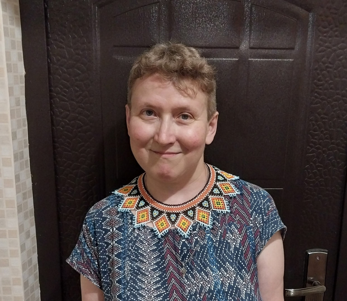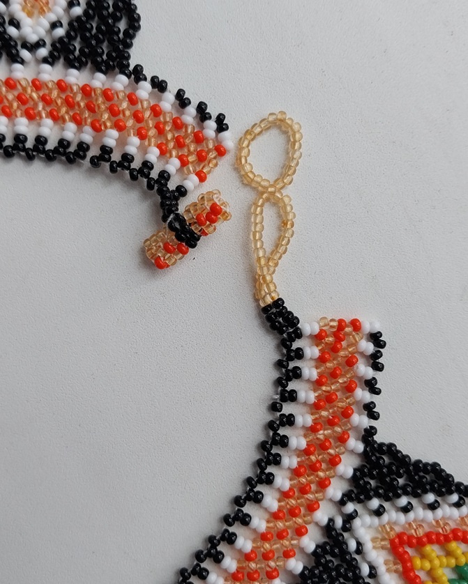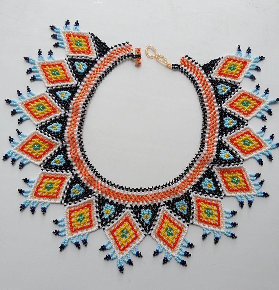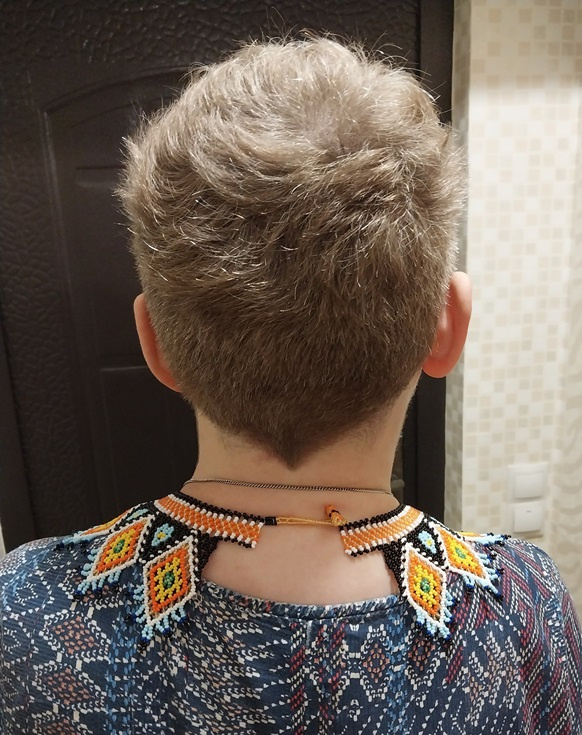Немного о процессе. Плела целиком, без подплетений. Удалось закруглить край — сверху везде по 3 поворотных бисеринки, а не по 4, как обычно. Лежит, как видите, ничего так. И на хозяйке хорошо прилег.
