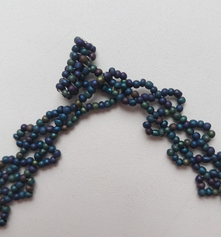 Сплелось неожиданно легко и быстро. Правда, не без огреха — крайняя бусинка криво пришилась, заметила уже когда закрепляла последние хвостики ниток.