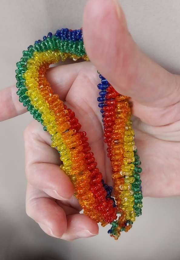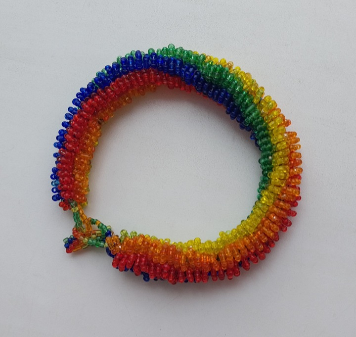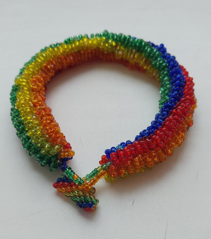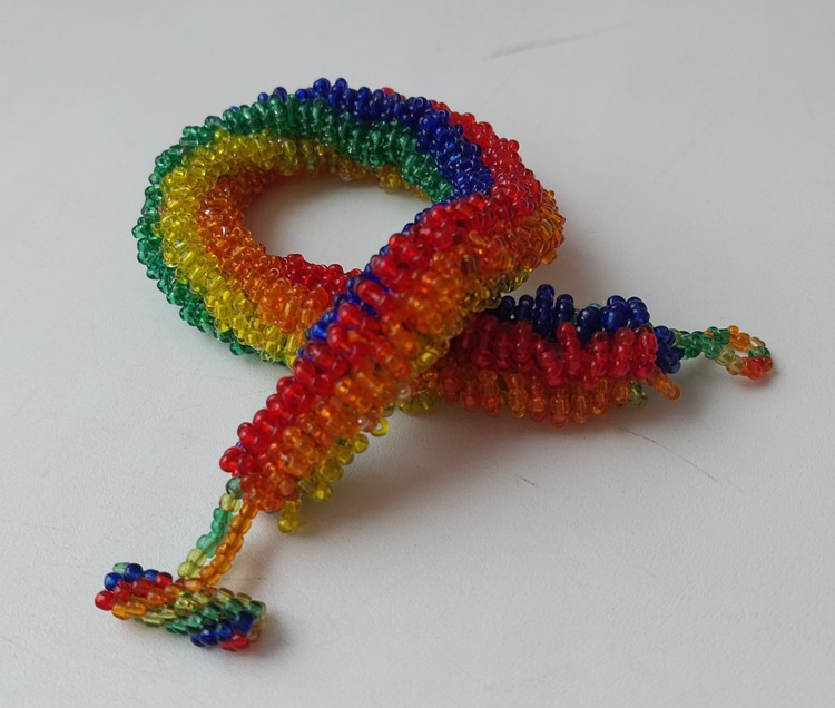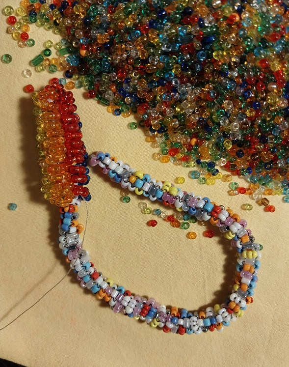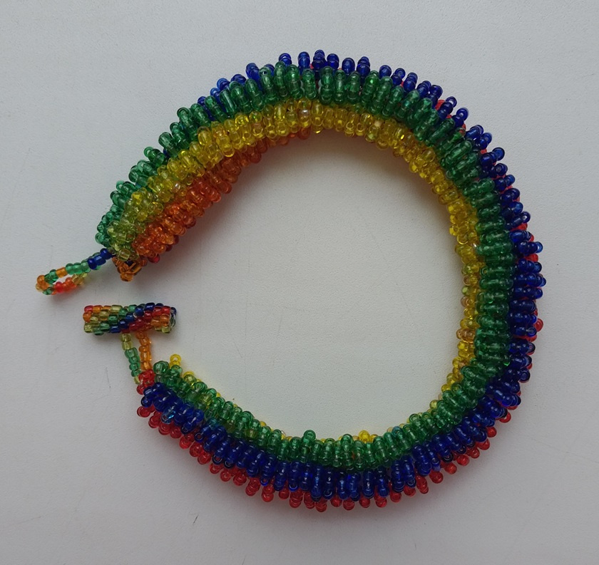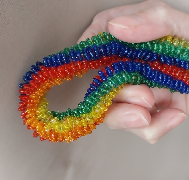 Попытка утилизовать китайский некондер. Ну то есть, он как раз очень красивый — цветное стекло есть стекло, во всей его… стеклянности. Словом, вот что вышло. Единственно, на руке слишком большой (и тяжелый). А вот на щиколотку — как раз! думаю, летом так стану ходить, сверкать. А чего? Красиво же, нет? Бисер, в смысле. А вот за результат… гм, гм. По технике могу сказать более внятно: это по сути расшивка мозаичной трубки, на 5 бисеринок.