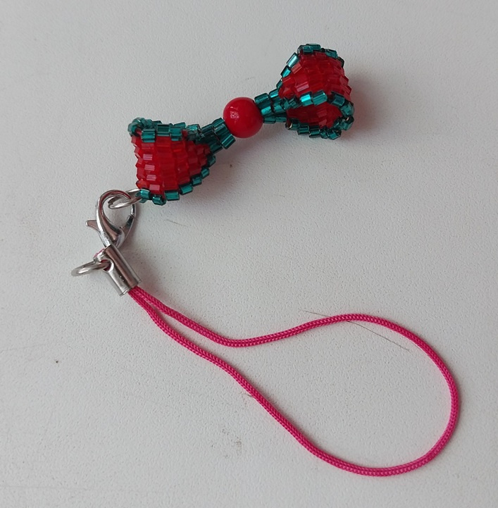 И бантик. Предполагалось колечко, по вот этому видео-МК. Но решила попробовать рубку… вышло крупновато (плетение кирпичное). Долго лежал, пока приделала бейлик, теперь брелочек. Даже на заколку-резинку не хочется — есть остренькие выступы, наверняка будет цеплять волосы, ни к чему.