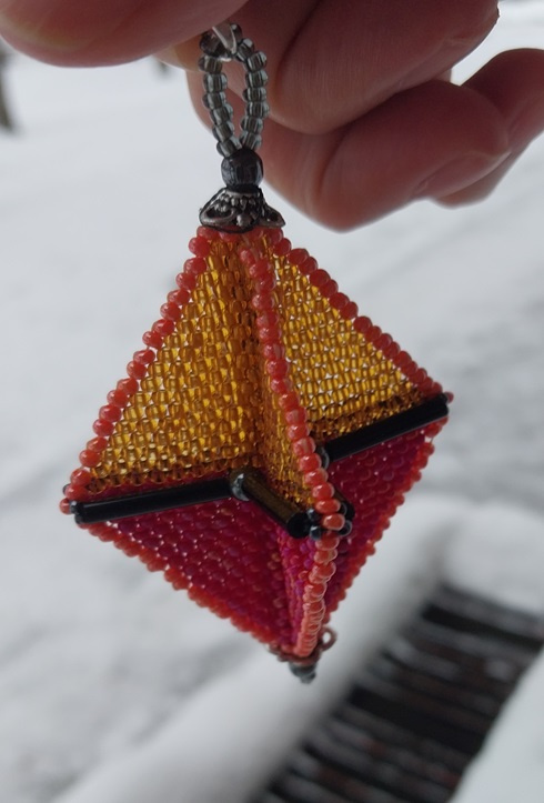 Кстати, схема, по-моему, вариабельная — в зависимости от длинны наличного стекляруса можно расчитать длину трубочки и ширину лепестков. Так что, и сережки можно, получается, если взять бисер помельче и поменьше.