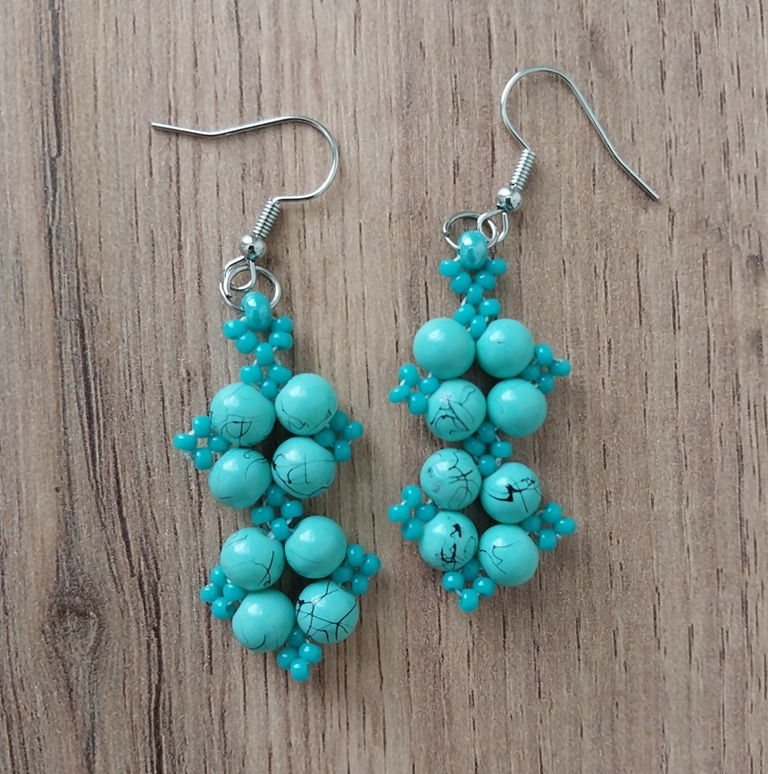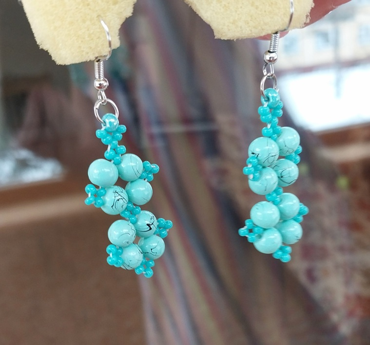У этих сережек долгая история. Увидела я их как бы ни у кого из вас, еще на БИ. И загорелась. Это сочетание гладких бусин, бисера, цветовое совпадение и простота (кажущаяся, как выяснилось) заворожило. И я принялась запасать материалы. Тогда их было от слова совсем не.