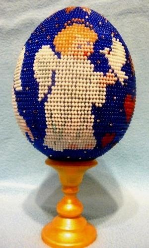 Сегодня только одно яичко, потому что оно само по себе. Высота яйца 12 см.Четыре ангела под рождественской звездой. Рисунок взяла с фото вышивки в инете. Правда там она была монохромная, поэтому цвета подбирала уже сама. Бисер чех 10.
